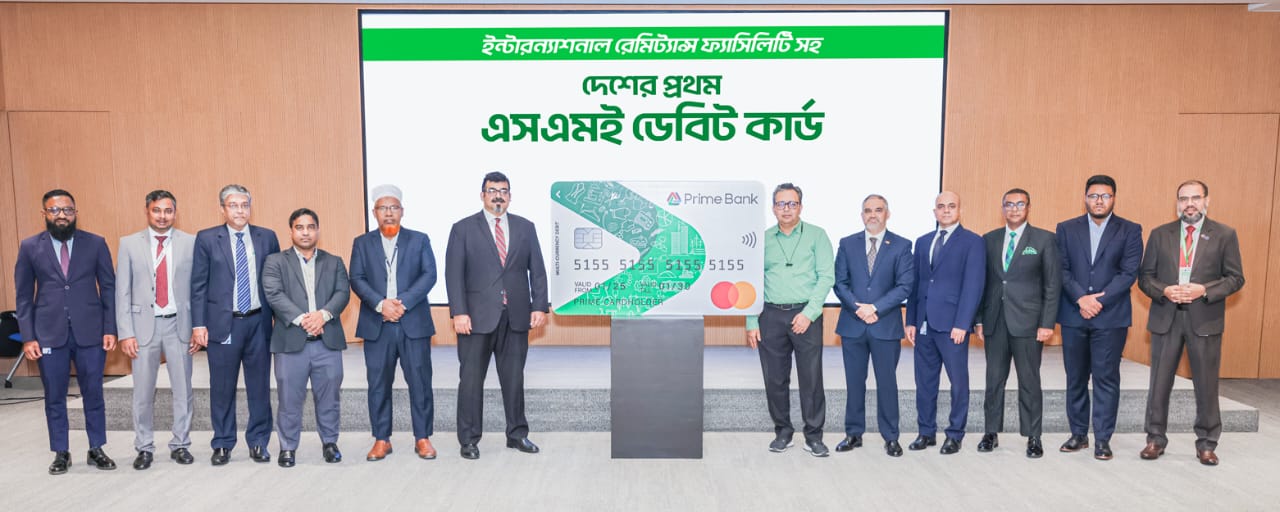 Staff Reporter  :  Prime Bank PLC has launched Bangladesh’s first-ever SME Debit Card with International Remittance Facility, enabling small and medium enterprises to make seamless international online payments for business purposes. The Prime Bank SME Debit Card can also be used locally for POS, ATM, and online transactions. Proprietorship concerns can avail this debit card while SMEs registered as Partnership or Limited can avail SME Prepaid cards.