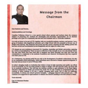 ভূতের মুখে রাম নাম”: শিক্ষা ব্যবসায়ও হাত : প্রতারক হয়েও গুলশানে কানাডিয়ান ট্রিলিনিয়াম স্কুল (সিটিএস) নামের একটি ইংলিশ মিডিয়াম স্কুলের চেয়ারম্যান তিনি। কোমলমতি শিশুদের উদ্দেশ্যে তিনি মাঝে মাঝে “শিক্ষণীয় বাণী” দেন।