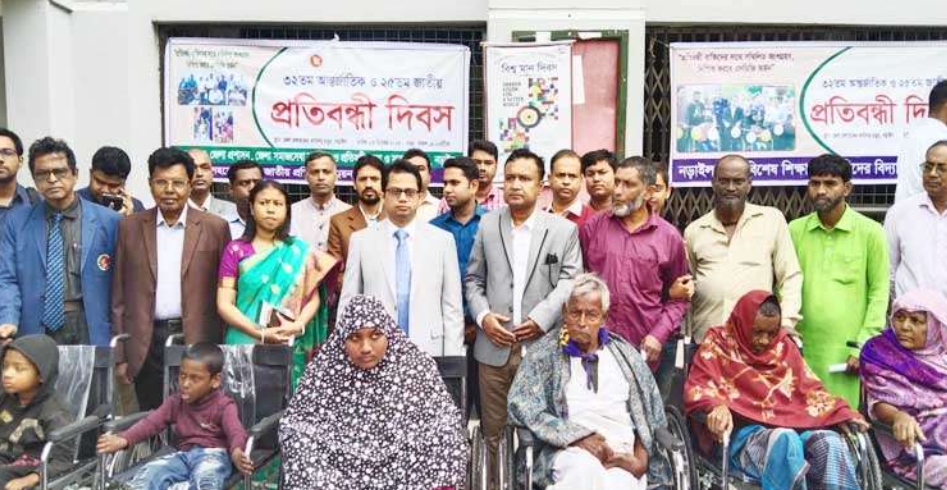 মো:রফিকুল ইসলাম,(নড়াইল) : প্রতিবন্ধী ব্যক্তিদের সাথে সম্মিলিত অংশগ্রহণ,নিশ্চিত করে এসডিজি অর্জন,এ প্রতিপাদ্যকে সামনে নিয়ে নড়াইলে ৩২তম আন্তর্জাতিক প্রতিবন্ধী দিবস ও ২৫তম জাতীয় প্রতিবন্ধী দিবস-২০২৩ পালন উপলক্ষে সংক্ষিপ্ত র্যালী,আলোচনা সভা ও সহায়ক উপকরণ বিতরণ করা হয়েছে। এছাড়াও উচ্চ মাধ্যমিক পরীক্ষায় উত্তীর্ণ ২৩ জন প্রতিবন্ধী শিক্ষার্থীর মাঝে ক্রেস্ট এবং প্রতিবন্ধীদের চিত্রাংকন প্রতিযোগিতা পুরস্কার বিতরণ করা হয়।