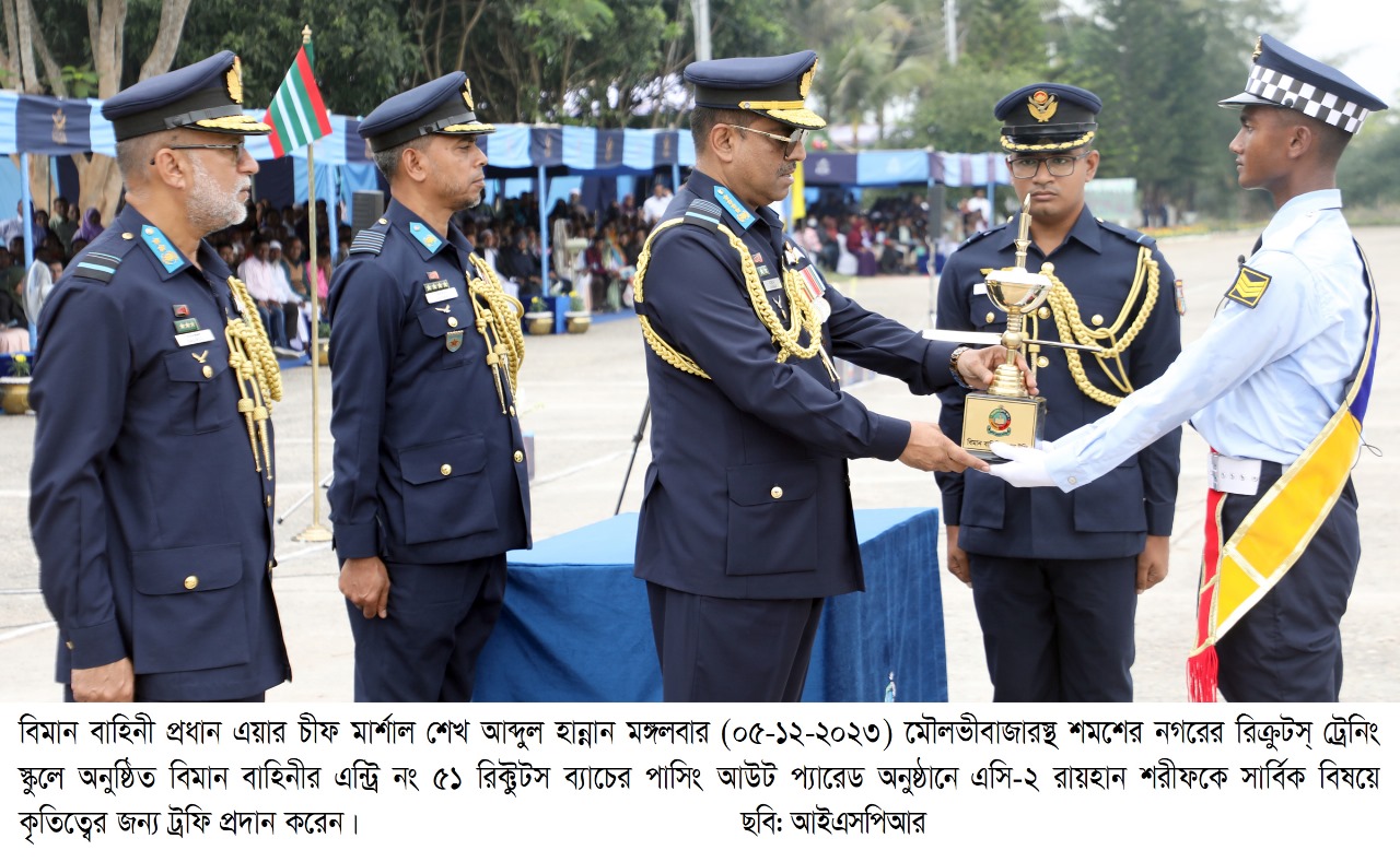 নিজস্ব প্রতিবেদক : গতকাল মঙ্গলবার ৫ ডিসেম্বর, বাংলাদেশ বিমান বাহিনীর ৫১তম নব বিমানসেনা দলের প্রশিক্ষণ সমাপনী কুচকাওয়াজ সিলেটের মৌলভীবাজার জেলার বাংলাদেশ বিমান বাহিনী স্টেশন শমশেরনগরে অবস্থিত রিক্রুটস্ ট্রেনিং স্কুল (আরটিএস)-এ অনুষ্ঠিত হয়েছে।