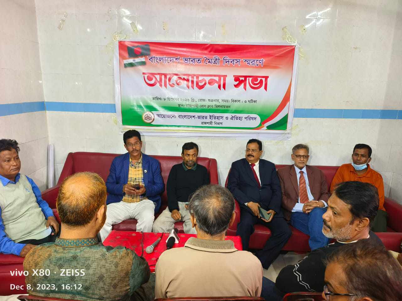 বাংলাদেশ-ভারত ইতিহাস ও ঐতিহ্য পরিষদ রাজশাহী বিভাগ আয়োজিত এই আলোচনা সভায় প্রধান অতিথি ছিলেন বীর মুক্তিযোদ্ধা শাহজাহান আলী বরজাহান।সংগঠনের সভাপতি প্রকৌশলিক শামসুল আলমের সভাপতিত্বে ও সাধারণ সম্পাদক সাইদুর রহমানের পরিচালনায় আলোচনা সভায় অন্যান্যের মধ্যে বক্তব্য রাখেন মুক্তিযুদ্ধের তথ্য সংগ্রাহক ওয়ালিউর রহমান বাবু, আন্তর্জাতিক রবীন্দ্র গবেষণা ইনস্টিটিউটের পরিচালক প্রফেসর ড. মতিউর রহমান , রাজশাহী বিশ্ববিদ্যালয়ের ইতিহাস বিভাগের প্রফেসর ড. গোলাম সারোয়ার, জননেতা আতাউর রহমান স্মৃতি পরিষদের সহ-সভাপতি সালাউদ্দিন মিন্টু, বাংলাদেশ কংগ্রেস পার্টি রাজশাহী মহানগরীর নেতা মোঃ মারুফ শাহারিয়া।বক্তারা বলেন মুক্তিযুদ্ধের শেষ পর্যায়ে ৬ই ডিসেম্বর ভারত বাংলাদেশকে স্বীকৃতি প্রদানের মাধ্যমে বিজয় তরন্বিত করে ।