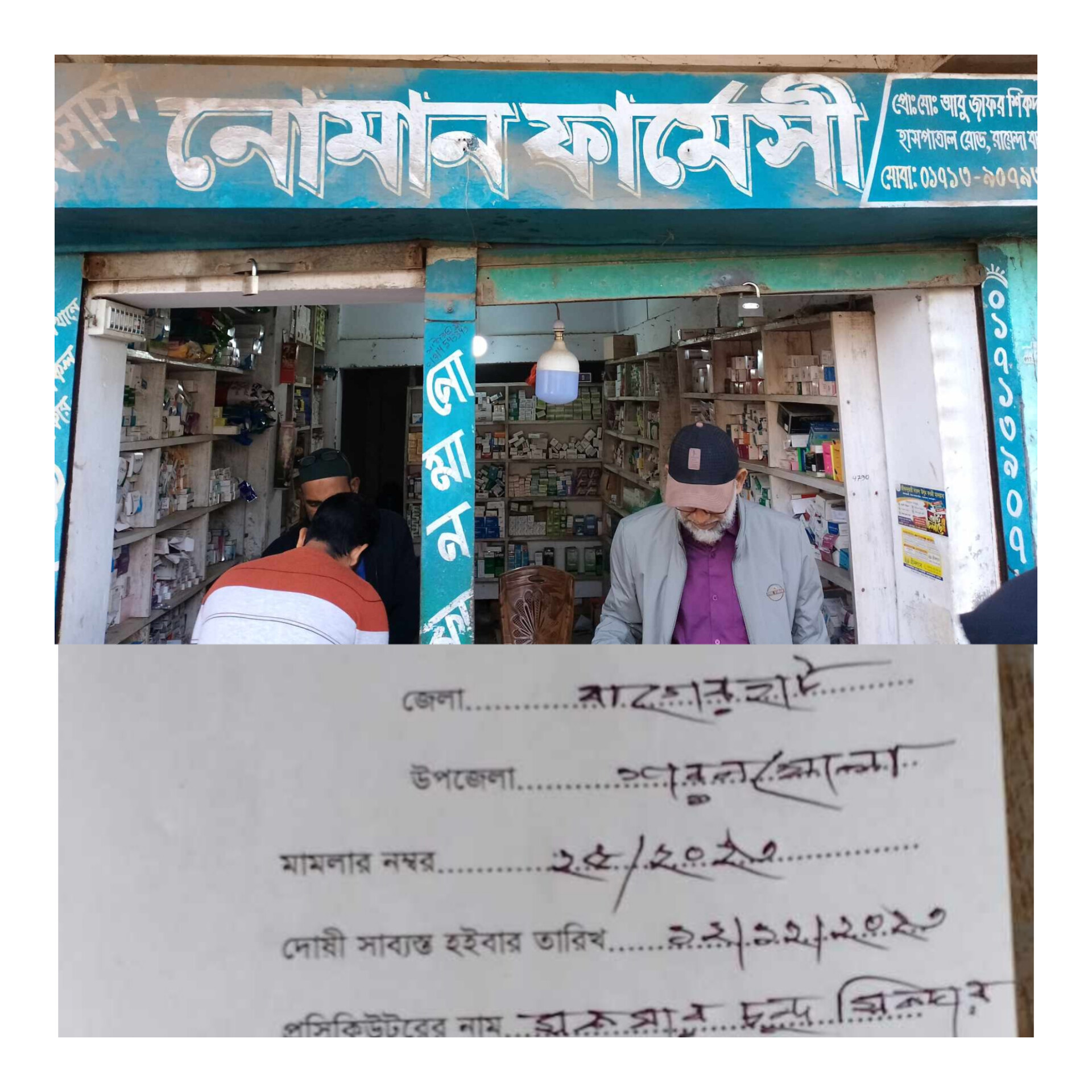 নইন আবু নাঈম তালুকদার,(বাগেরহাট)ঃ বাগেরহাটের শরণখোলায় উপজেলা নির্বাহী কর্মকর্তা ও নির্বাহী ম্যাজিস্ট্রেট জাহিদুল ইসলাম শামিম ভ্রাম্যমাণ আদালতের মাধ্যমে দুই ওষুধ ব্যবসায়িকে দুই হাজার পাঁচশত টাকা জরিমানা করেছেন। ১২ নভেম্বর দদুপুর ১২টায় হাসপাতাল সংলগ্ন পাঁচ রাস্তার মোড়ে এ অভিযান পরিচালনা করেন।