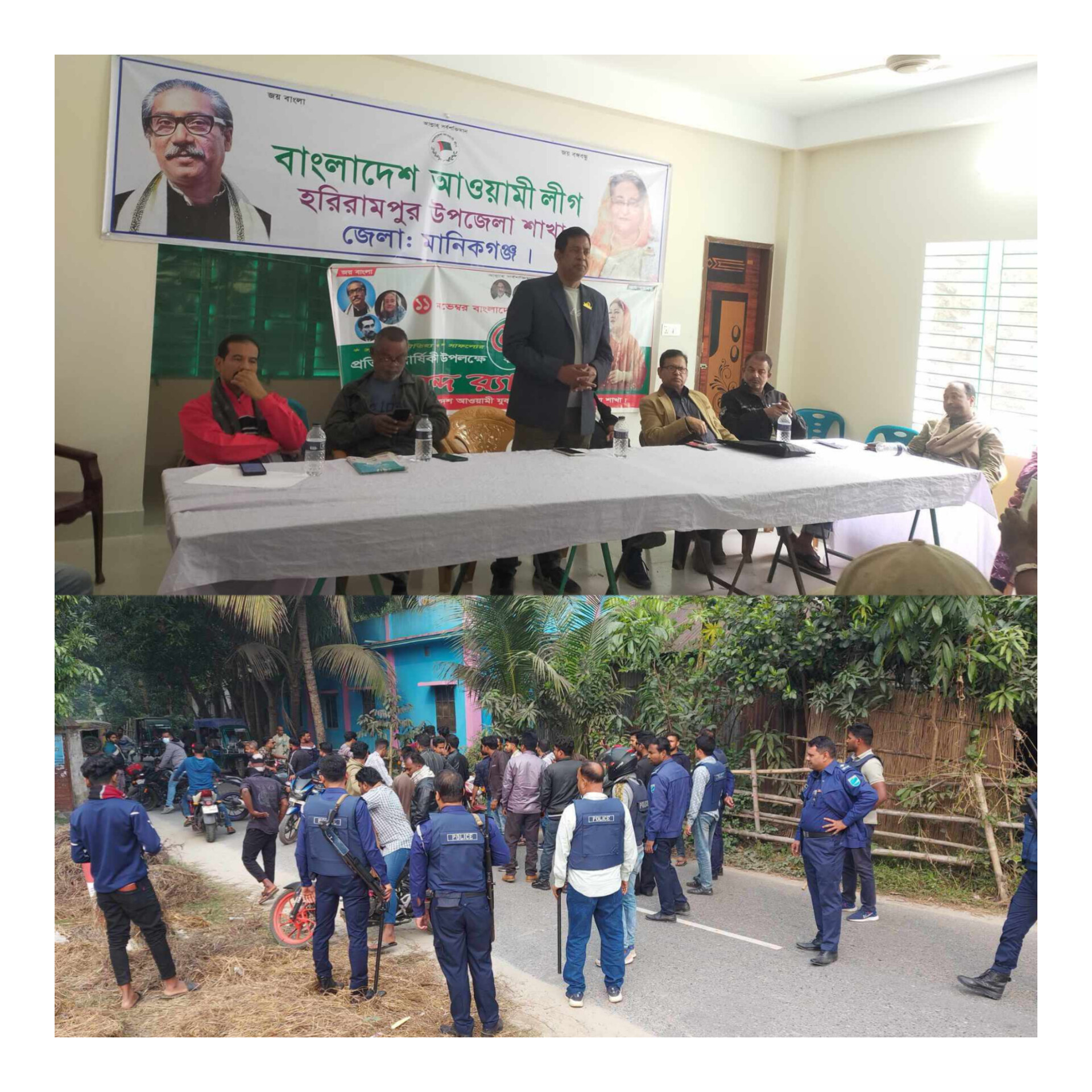 হরিরামপুর থানার ভারপ্রাপ্ত কর্মকর্তা (ওসি) শাহ নূর এ আলম বলেন, আপাতত কোনো সমস্যা নেই। আইনশৃঙ্খলা পরিস্থিতি স্বাভাবিক আছে। পাশাপাশি দুটি অফিস থাকলে নেতাকর্মীদের পদচারণা একটু বেশিই থাকবে। তবে কিছু মোটরসাইকেলের বহর আসায় নির্বাচনী আচরণ বিধি পালনে সাময়িক কিছু সময়ের জন্য ট্রাক দিয়ে রাস্তা আটকে দেয়া হয়। যেন মোটরসাইকেলের বহর নিয়ে কেউ উপজেলা চত্বরে ঢুকতে না পারে।