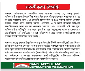 এতদ্বারা সর্বসাধারণের অবগতির জন্য জানানো যাচ্ছে যে, রংধনু গ্রুপের মালিকানাধীন রংধনু বিল্ডার্স লিঃ এর মালিক মো: রফিকুল ইসলাম এবং তার পুত্র (১) কাওছার আহমেদ অপু, (২) মেহেদী হাসান দিপু ও (৩) পুত্রবধূ মালিহা হোসেন গংদের নিকট হতে বিভিন্ন ব্যক্তি, প্রতিষ্ঠান ও অর্থলগ্নী প্রতিষ্ঠান জমি/প্লট ক্রয়-বিক্রয়সহ নানা ধরনের লেনদেন করছেন এবং অনেকেই এই সব ভুয়া মালিকানাধীন জমি/প্লট ক্রয় করে প্রতারিত হয়ে বাংলাদেশ ল্যান্ড ডেভেলপারস এসোসিয়েশন (বিএলডিএ) বরাবরে অভিযোগ করেছেন। আমরা অভিযোগগুলোর সত্যতা যাচাই-বাছাইয়ের কাজ করছি।
