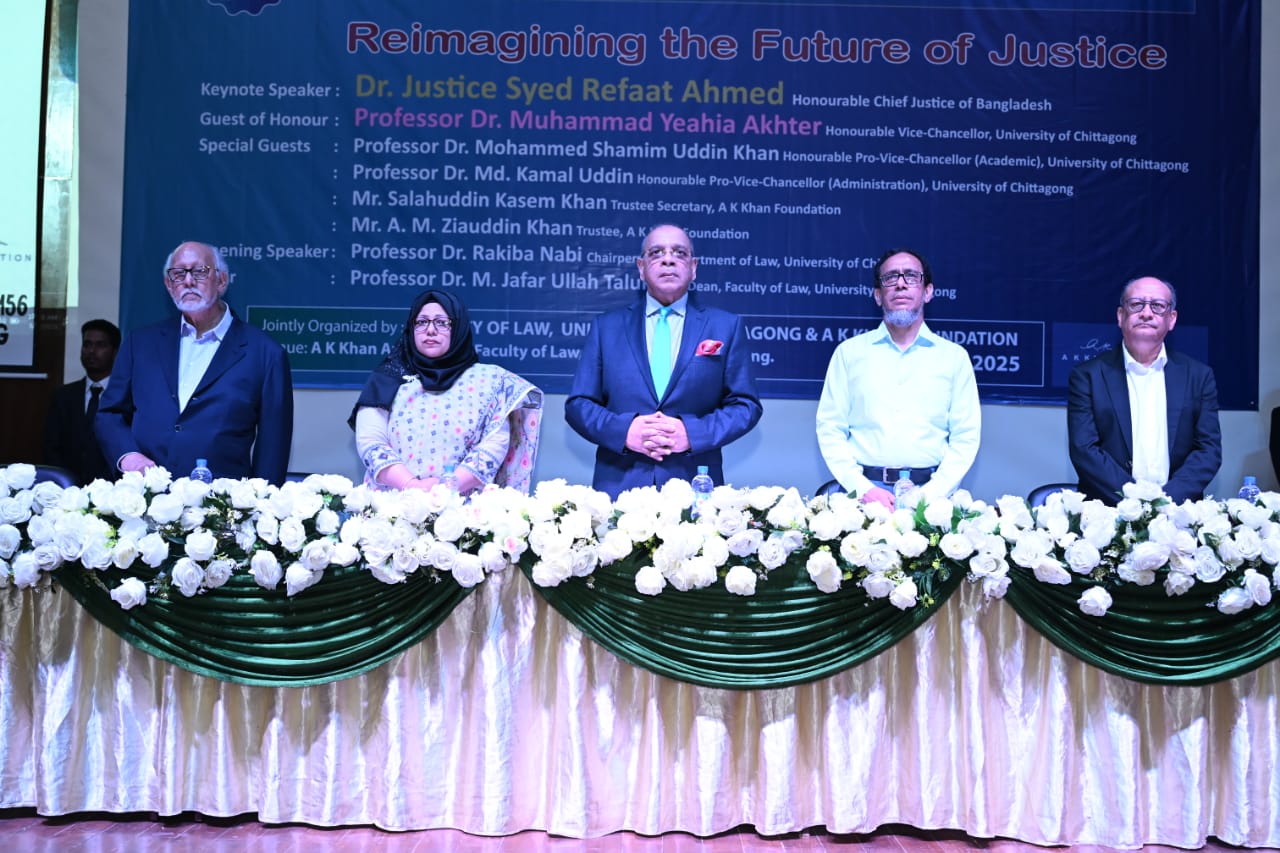 নিজস্ব প্রতিনিধি (চট্টগ্রাম) : আজ রবিবার ০৪ মে, সকাল ৯ টায় বাংলাদেশের প্রধান বিচারপতি ড. সৈয়দ রেফাত আহমেদ চট্টগ্রাম বিশ্ববিদ্যালায়ের আইন অনুষদের অডিটোরিয়ামে এ. কে. খান ফাইনন্ডেশন এবং চট্টগ্রাম বিশ্ববিদ্যালায়ের আইন অনুষদের যৌথ উদ্যোগে আয়োজিত “৭ম এ. কে. খান মেমোরিয়াল ল’ লেকচার-২০২৫”-এ “ Remaining the Future of Justice ”- শীর্ষক সেমিনারে keynote Speaker হিসেবে বক্তব্য প্রদান করেন। অনুষ্ঠানে সম্মানিত অতিথি হিসেবে উপস্থিত ছিলেন চট্টগ্রাম বিশ্ববিদ্যালায়ের ভিসি অধ্যাপক ড. ইয়াহ্ইয়া আখতার। অনুষ্ঠানে সভাপতিত্ব করেন চট্টগ্রাম বিশ্ববিদ্যালায়ের আইন অনুষদের ডিন অধ্যাপক ড. এম জাফরুল্লাহ্ তালুকদার। উক্ত অনুষ্ঠানে চট্টগাম বিশ্ববিদ্যালয়ের ছাত্র, শিক্ষক, আইনজ্ঞ, আইনজীবী, অন্যান্য পেশাজীবীসহ গুরুত্বপূর্ণ ব্যক্তিবর্গ উপস্থিত ছিলেন।