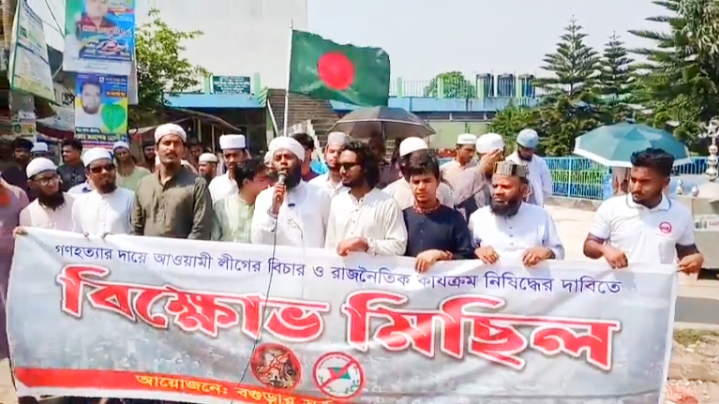 মোস্তফা আল মাসুদ,(বগুড়া) : গণহত্যার দায়ে আওয়ামী লীগের বিচার ও রাজনৈতিক কার্যক্রম নিষিদ্ধের দাবিতে সর্বস্তরের জনসাধারণের বিক্ষোভ মিছিল ।