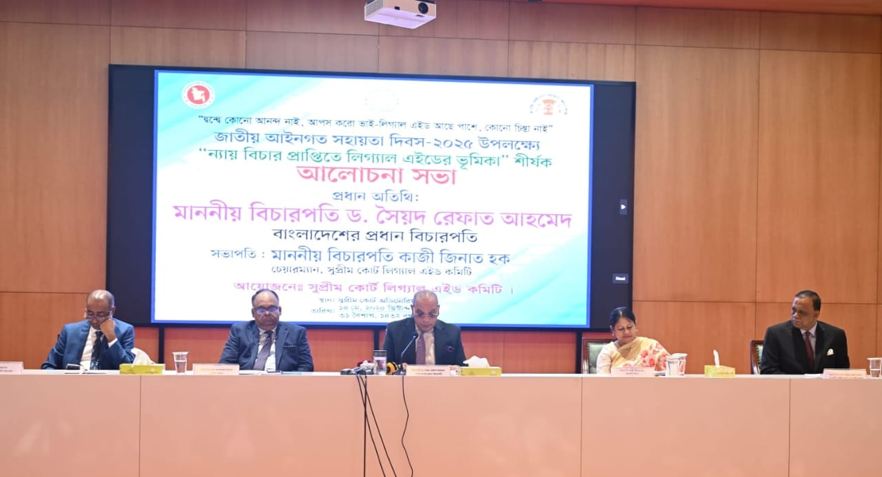 নিজস্ব প্রতিবেদক : আজ বুধবার ১৪ মে, বিকাল ৪ টা ৩০ মিনিটের সময় সুপ্রীম কোর্ট অডিটোরিয়ামে সুপ্রীম কোর্ট লিগ্যাাল এইড কমিটির উদ্যোগে জাতীয় আইনগত সহায়তা দিবস-২০২৫ উপলক্ষ্যে “ন্যায়বিচার প্রাপ্তিতে লিগ্যাল এইডের ভূমিকা”- শীর্ষক আলোচনা সভার আয়োজন করা হয়।