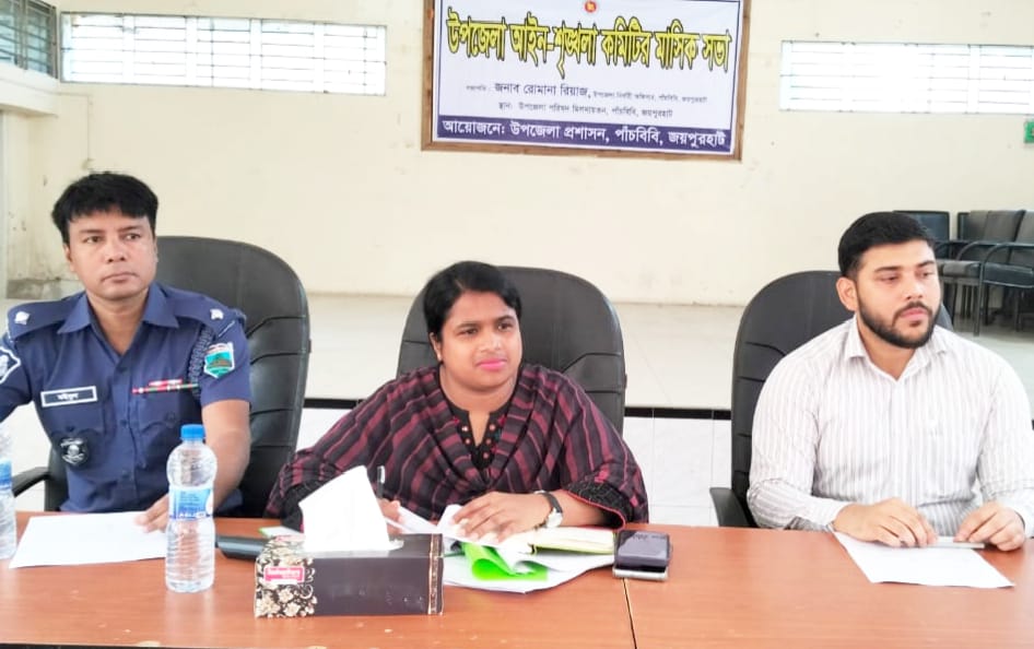 পাঁচবিবি (জয়পুরহাট) প্রতিনিধি : জয়পুরহাটের পাঁচবিবি উপজেলা প্রশাসনের আয়োজনে আইনশৃঙ্খলা কমিটির মাসিক সভা হয়েছে । বৃহস্পতিবার সকাল দশ’টায় উপজেলা পরিষদ অডিটোরিয়ামে মাসিক সভা অনুষ্ঠিত হয়। সভায় সভাপতিত্ব করেন উপজেলা নির্বাহী কর্মকর্তা রোমানা রিয়াজ।