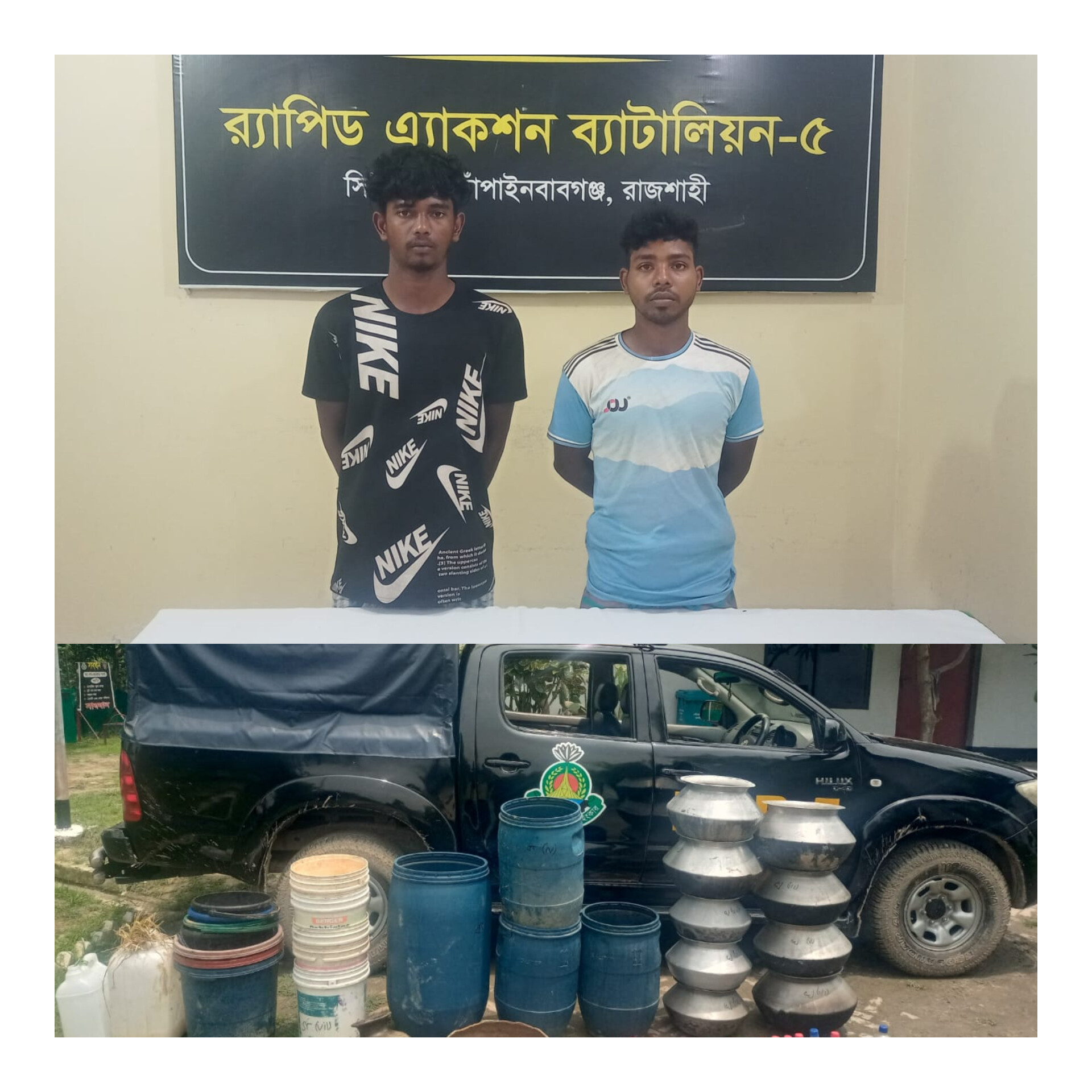 উক্ত মাদক বিরোধী বিশেষ অভিযান পরিচালনা কালে চোলাই মদ তৈরী, সংরক্ষণ ও বিক্রয় করার অপরাধে আবির মুর্মু (২১), পিতা-লাতোয়া মুর্মু, মাতা-দুলী রানী, সাং-বাবুডাইং পিকনিক কর্নার, থানা-চাঁপাইনবাবগঞ্জ সদর, এবং শ্রী আনন্দ কর্মকার (২০), পিতা-স¤্রাট কর্মকার, মাতা শ্রীমতি দুলিয়া, সাং-রহনপুর নুনগোলা, থানা-গোমস্তাপুর, উভয় জেলা-চাঁপাইনবাবগঞ্জদ্বয়কে চোলাই মদ-১২০৫ লিটার এবং চোলাই মদ প্রস্তুত করণের সময় বিভিন্ন উপকরণ সহ তাদেরকে হাতেনাতে গ্রেফতার করে। তারা দীর্ঘ দিন ধরে চোলাই মদ প্রস্তুত করতঃ বিভিন্ন এলাকায় সরবরাহ করতো।
