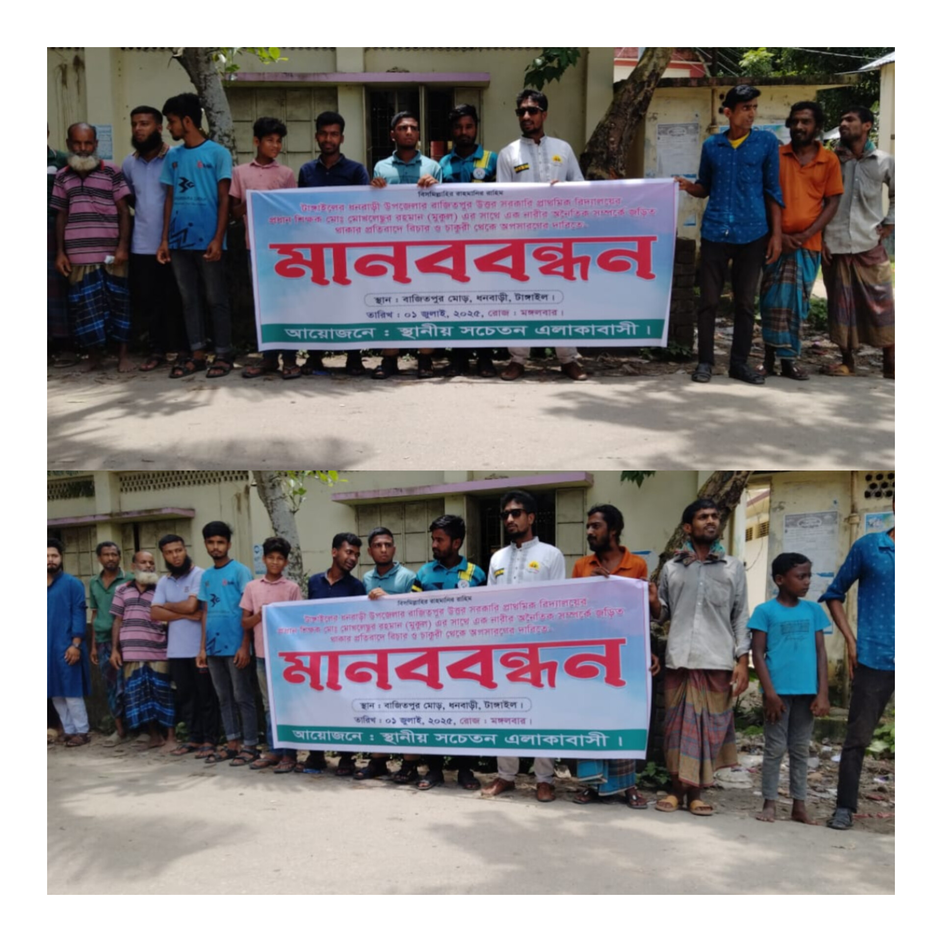 মঙ্গলবার (১ জুলাই) দুপুরে বিদ্যালয়ের প্রধান ফটকের সামনে স্থানীয়রা প্রধান শিক্ষক মোখলেছুর রহমান মুকুলের অপসারণের দাবিতে এই মানববন্ধনে অংশ নেন। মানববন্ধনে বক্তারা অভিযোগ করেন, বিদ্যালয়ের এক খন্ডকালীন নারী কর্মচারীর সঙ্গে প্রধান শিক্ষকের অশোভন আচরণের গুঞ্জন সম্প্রতি এলাকায় ছড়িয়ে পড়ে। সামাজিক যোগাযোগমাধ্যমে একটি ভিডিও ভাইরাল হওয়ার পর বিষয়টি নিয়ে জনমনে চাঞ্চল্য সৃষ্টি হয়। এ নিয়ে এলাকাবাসীর মধ্যে অসন্তোষ তৈরি হয়।