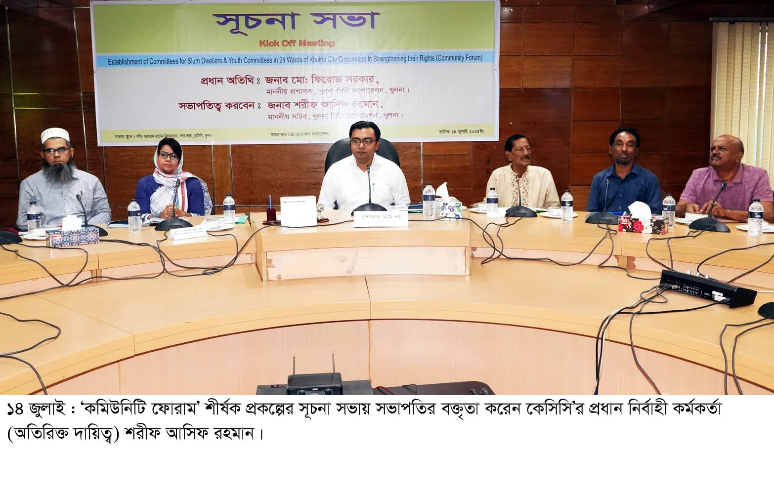 ‘‘ইস্টাবলিশমেন্ট অব কমিটিস ফর স্লাম ডুয়েলার্স এন্ড ইয়ুথ কমিটিস ইন ২৪ ওয়াডর্স অব খুলনা সিটি কর্পোরেশন টু স্ট্রেন্দেনিং দেয়ার রাইটস (কমিউনিটি ফোরাম)’’ শীর্ষক প্রকল্পের সূচনা সভা আজ সোমবার সকালে নগর ভবনের শহিদ আলতাফ মিলনায়তনে অনুষ্ঠিত হয়। সভায় সভাপতিত্ব করেন কেসিসি’র প্রধান নির্বাহী কর্মকর্তা (অতিরিক্ত দায়িত্ব) শরীফ আসিফ রহমান।