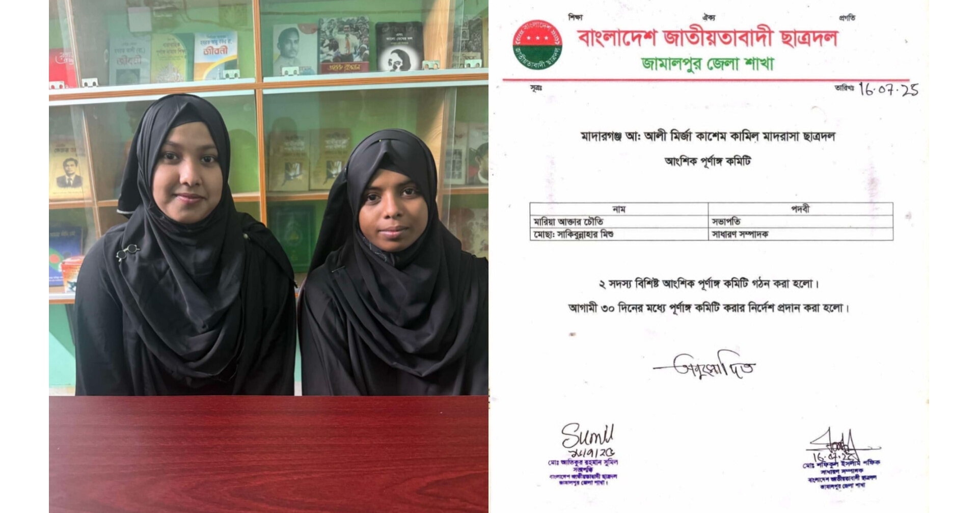 মাদারগঞ্জ আবদুল আলী মির্জা কাশেম কামিল মাদ্রাসার ইতিহাসে প্রথমবারের মতো গঠিত হলো বাংলাদেশ জাতীয়তাবাদী ছাত্রদলের আনুষ্ঠানিক কমিটি। মাদরাসা রাজনৈতিক পরিমণ্ডলে এটিই ছাত্রদলের প্রথম সাংগঠনিক উপস্থিতি ও দলীয় রাজনীতিতে এক নতুন অধ্যায়ের সূচনা করেছে বলে মন্তব্য করেছেন বিভিন্ন রাজনৈতিক নেতৃবৃন্দ। বুধবার (১৬ জুন) সন্ধ্যায় জামালপুর জেলা ছাত্রদলের সভাপতি মো: আতিকুর রহমান সুমিল ও সাধারণ সম্পাদক মো: শফিকুল ইসলাম শফিক এর এর যৌথ স্বাক্ষরে অনুমোদন করা হয়। নবগঠিত কমিটিতে সভাপতি হিসেবে মারিয়া আক্তার চৌতি ও সাধারণ হিসেবে মোছা: সাকিবুন্নাহার মিশুকে সাধারণ সম্পাদক পদে ঘোষণা করা হয় ।