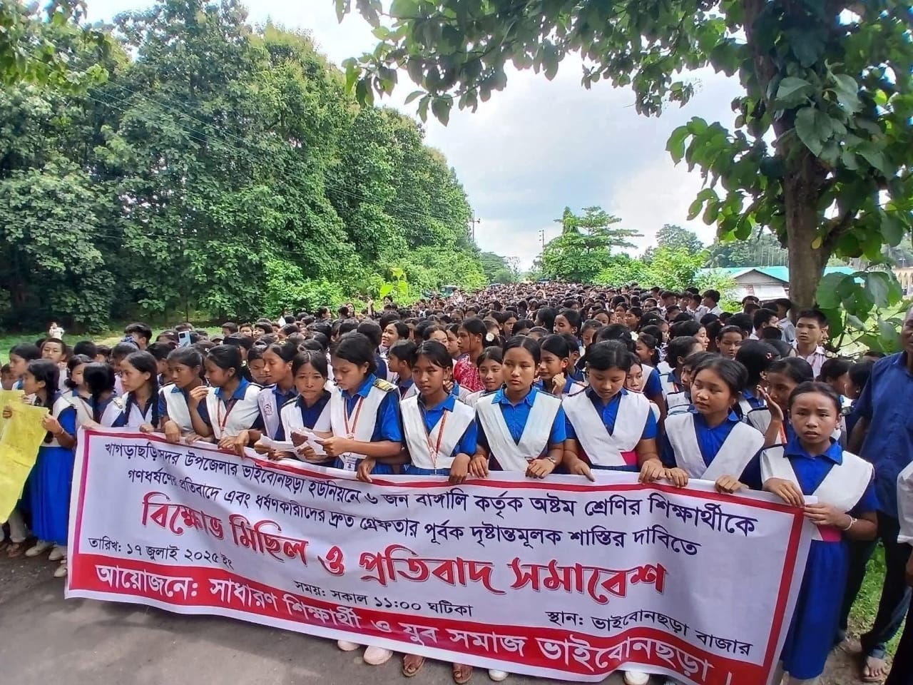 বিক্ষোভে উত্তাল খাগড়াছড়ি : ঘটনার খবর ছড়িয়ে পড়তেই খাগড়াছড়ি সদর, ভাইবোনছড়া ও আশপাশের এলাকায় শিক্ষার্থী, অভিভাবক ও সচেতন নাগরিকদের অংশগ্রহণে বিক্ষোভ মিছিল ও প্রতিবাদ সমাবেশ অনুষ্ঠিত হয়।