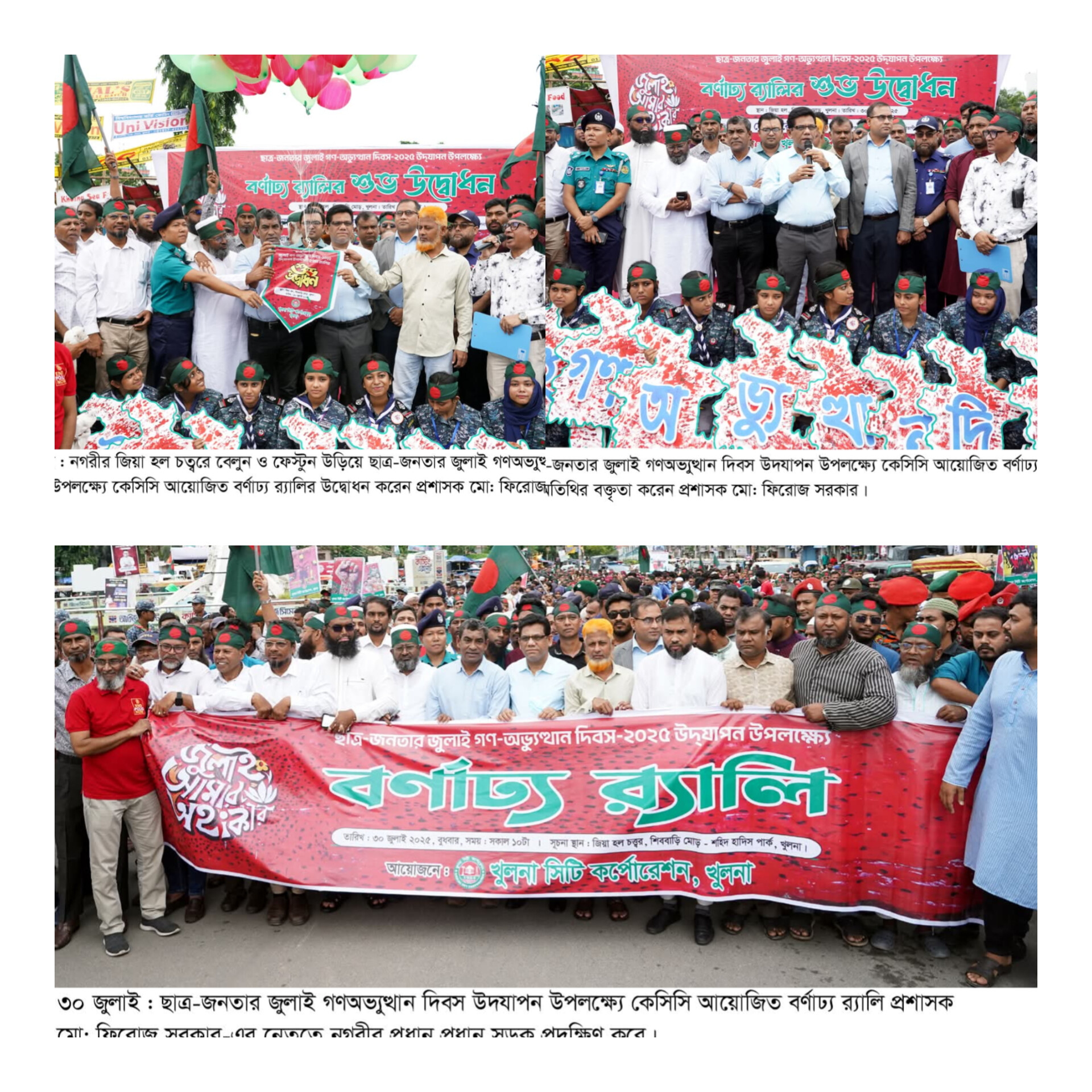 নিজস্ব প্রতিনিধি (খুলনা) : ছাত্র-জনতার জুলাই গণঅভ্যুত্থান দিবস উদযাপন উপলক্ষ্যে খুলনা সিটি কর্পোরেশনের উদ্যোগে আজ বুধবার সকালে নগরীতে একটি বর্ণাঢ্য র্যালি অনুষ্ঠিত হয়। কেসিসি প্রশাসক মো: ফিরোজ সরকার নগরীর জিয়া হল চত্বরে প্রধান অতিথি হিসেবে উপস্থিত থেকে বেলুন ও কবুতর উড়িয়ে র্যালির উদ্বোধন করেন। র্যালিটি জিয়া হল চত্বর থেকে শুরু হয়ে শহিদ হাদিস পার্কে এসে শেষ হয়।