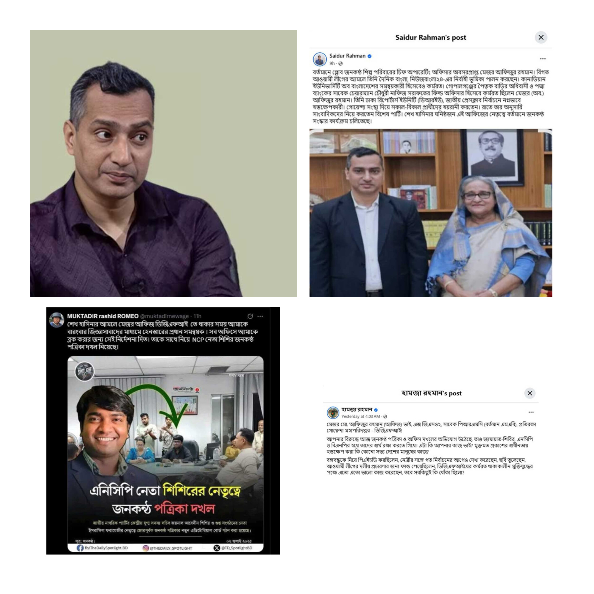 তিনি লিখেছেন, “শেখ হাসিনার আমলে মেজর আফিজ ডিজিএফআইতে থাকার সময় আমাকে বারংবার জিজ্ঞাসাবাদের মাধ্যমে হেনস্তার প্রধান সমন্বয়ক। সব অফিসে আমাকে ব্লক করার জন্য সেই নির্দেশনা দিত। তাকে সাথে নিয়ে NCP নেতা শিশির জনকন্ঠ পত্রিকা দখল নিয়েছে।” আফিজ যখন ডিজিএফআইয়ে দায়িত্বরত, তখন থেকেই পদ্মা ব্যাংকের সাবেক চেয়ারম্যান নাফিজ সরাফাতের সঙ্গে তার ঘনিষ্ঠতার কথা সাংবাদিকদের মধ্যে আলোচনার বিষয় ছিল।