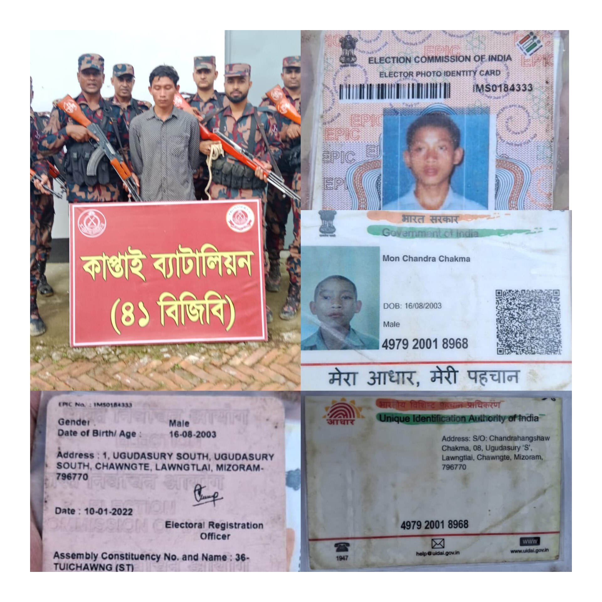 নিজস্ব প্রতিনিধি (রাঙামাটি) : রাঙামাটির জুড়াছড়ি উপজেলার সীমান্তবর্তী বগাখালী বাজার এলাকা থেকে ভারতীয় আধার কার্ডসহ মন চন্দ্র চাকমা (২২) নামের এক ভারতীয় নাগরিককে আটক করেছে বিজিবি।