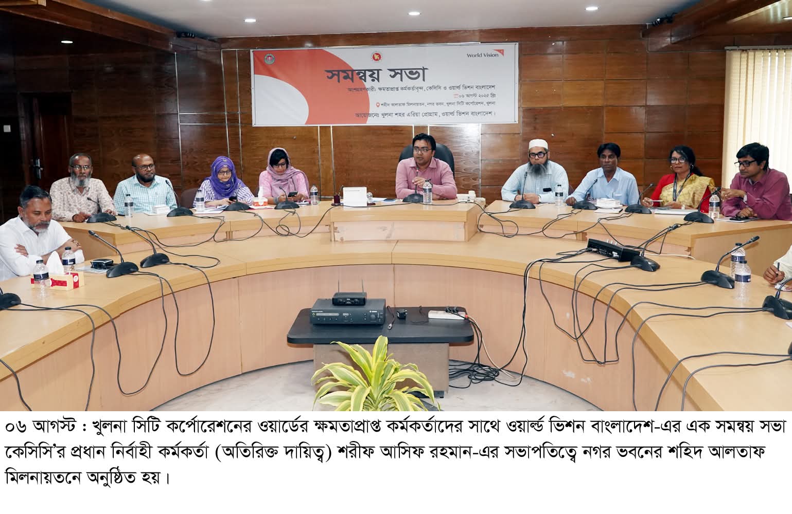 জানা গেছে, খুলনা সিটি কর্পোরেশনের ওয়ার্ডের ক্ষমতাপ্রাপ্ত কর্মকর্তাদের সাথে বেসরকারি সংস্থা ওয়ার্ল্ড ভিশন-বাংলাদেশ এর এক সমন্বয় সভা গতকাল বুধবার ৭ আগস্ট, সকালে নগর ভবনের শহিদ আলতাফ মিলনায়তনে অনুষ্ঠিত হয়। সভায় সভাপতিত্ব করেন কেসিসি’র প্রধান নির্বাহী কর্মকর্তা (অতিরিক্ত দায়িত্ব) শরীফ আসিফ রহমান।