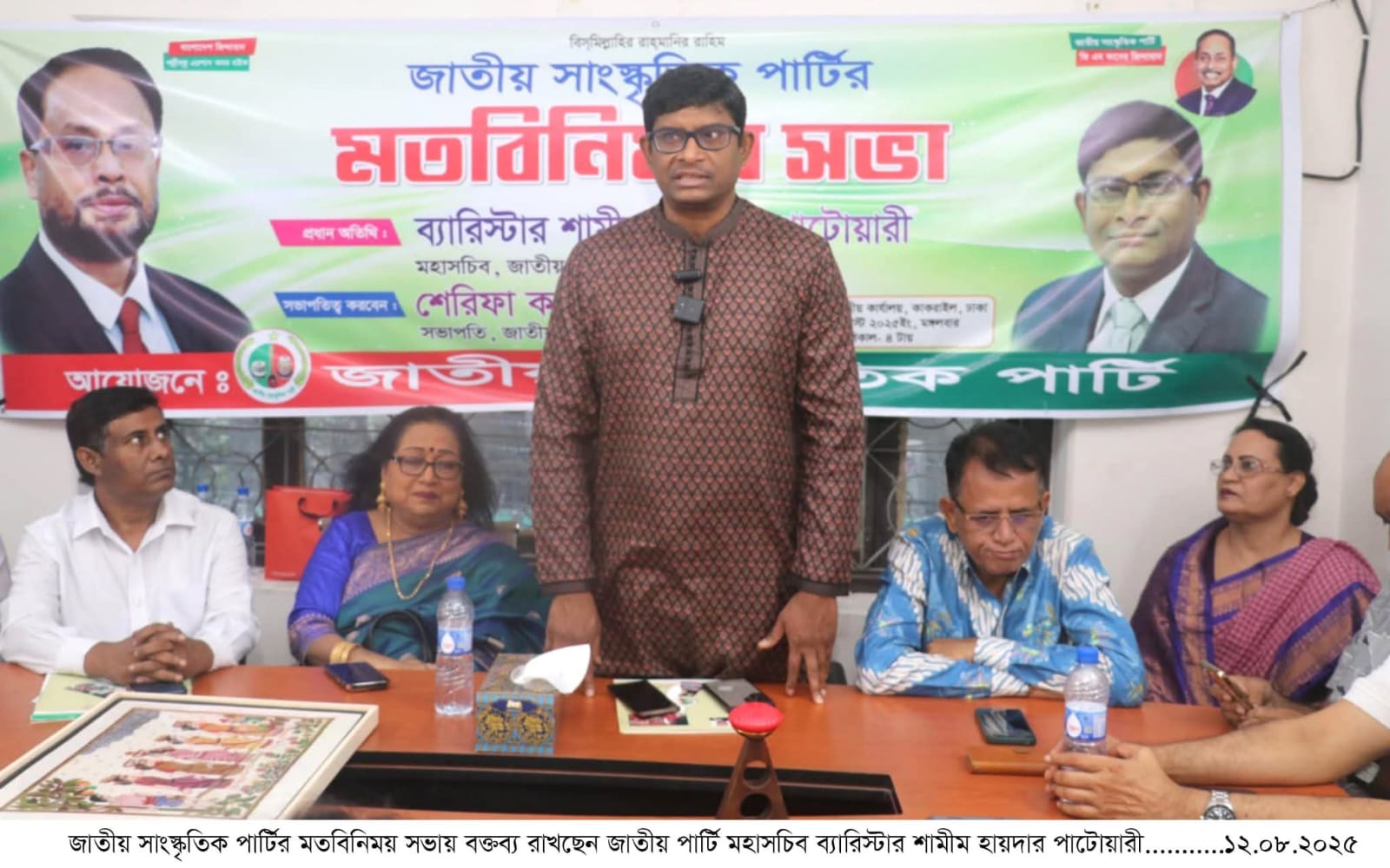 আজ বিকেলে জাতীয় পার্টির প্রেসিডিয়াম সদস্য ও জাতীয় সাংস্কৃতিক পার্টির সভাপতি শেরীফা কাদের এর সভাপতিত্বে সাংস্কৃতিক পার্টির সাথে এক মতবিনিময় সভায় তিনি প্রধান অতিথি হিসেবে বক্তব্য রাখছিলেন।