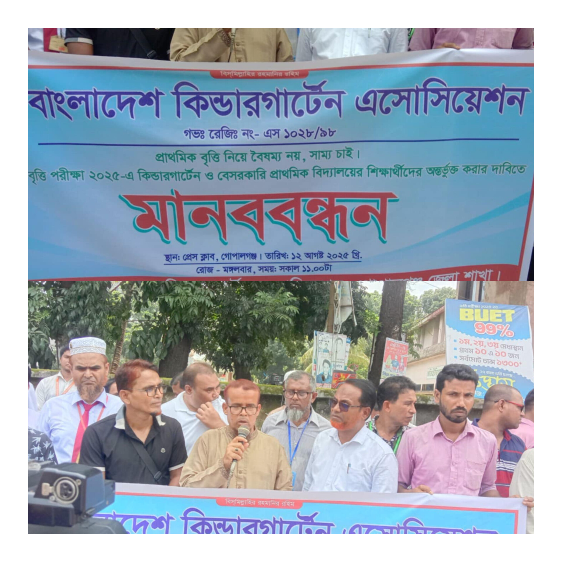 মোঃ সাইফুর রশিদ চৌধুরী : গোপালগঞ্জে কিন্ডারগার্টেন ও বেসরকারি প্রাথমিক বিদ্যালয়ের শিক্ষার্থীদের সরকারি প্রাথমিক বৃত্তি পরীক্ষায় অংশগ্রহণের সুযোগ প্রদানের দাবিতে মানববন্ধন কর্মসূচি পালন করা হয়েছে। মঙ্গলবার (১২আগস্ট) দুপুরে প্রেসক্লাব গোপালগঞ্জ এর সামনে মানববন্ধন করে বাংলাদেশ কিন্ডারগার্টেন এসোসিয়েশন গোপালগঞ্জ জেলা শাখা।