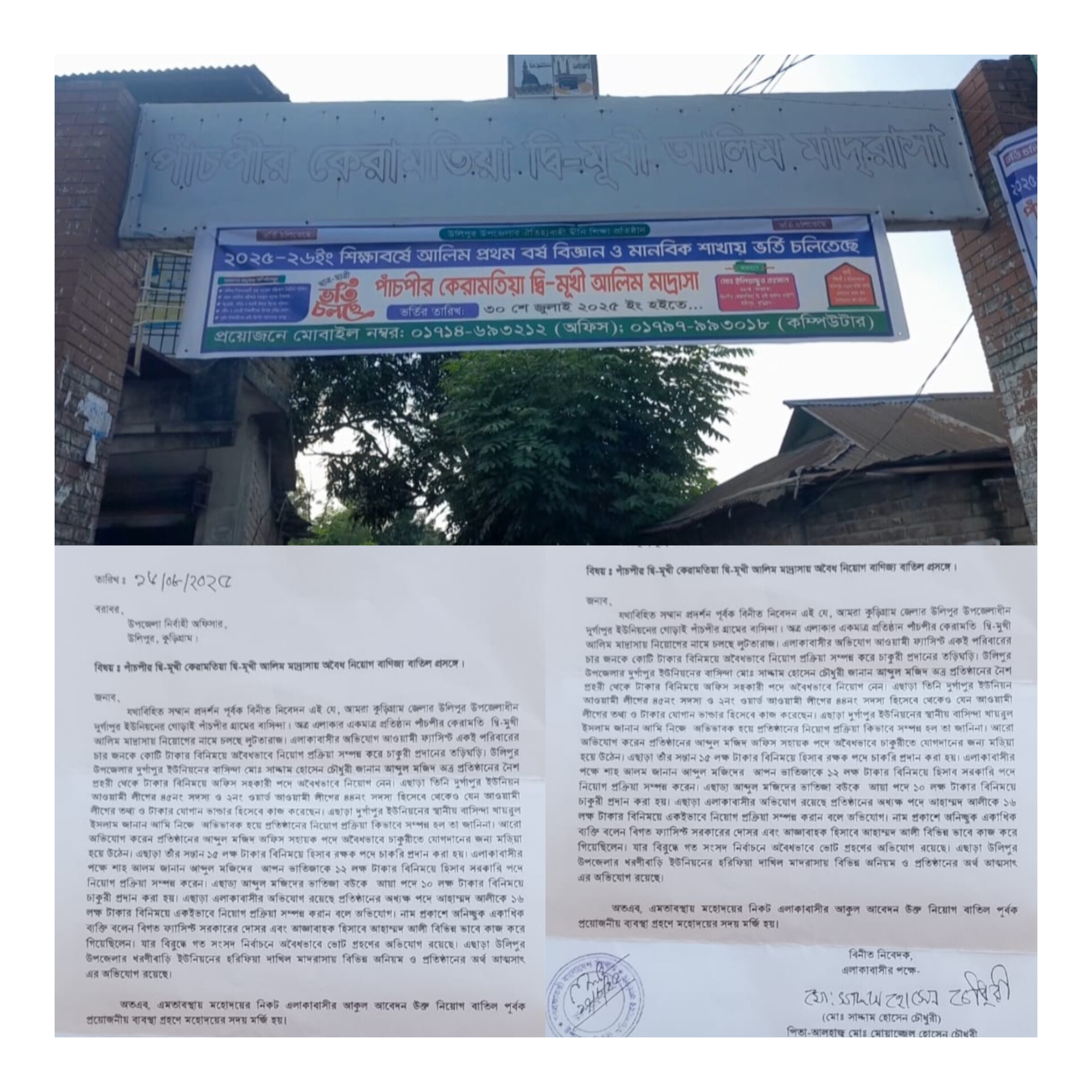 মোঃ বুলবুল ইসলাম, (কুড়িগ্রাম) : কুড়িগ্রামের উলিপুর উপজেলার পাঁচপীর কেরামতিয়া দ্বিমুখী আলিম মাদ্রাসায় মোটা অঙ্কের টাকার বিনিময়ে নিয়ম বহিভূর্তভাবে নিয়োগের নামে বাণিজ্য । এলাকাবাসীর অভিযোগ একই পরিবারের চার জনকে প্রায় কোটি টাকার বিনিময়ে অবৈধভাবে নিয়োগ প্রক্রিয়া সম্পূর্ণ করে চাকুরী প্রদানের তড়িঘড়ি।