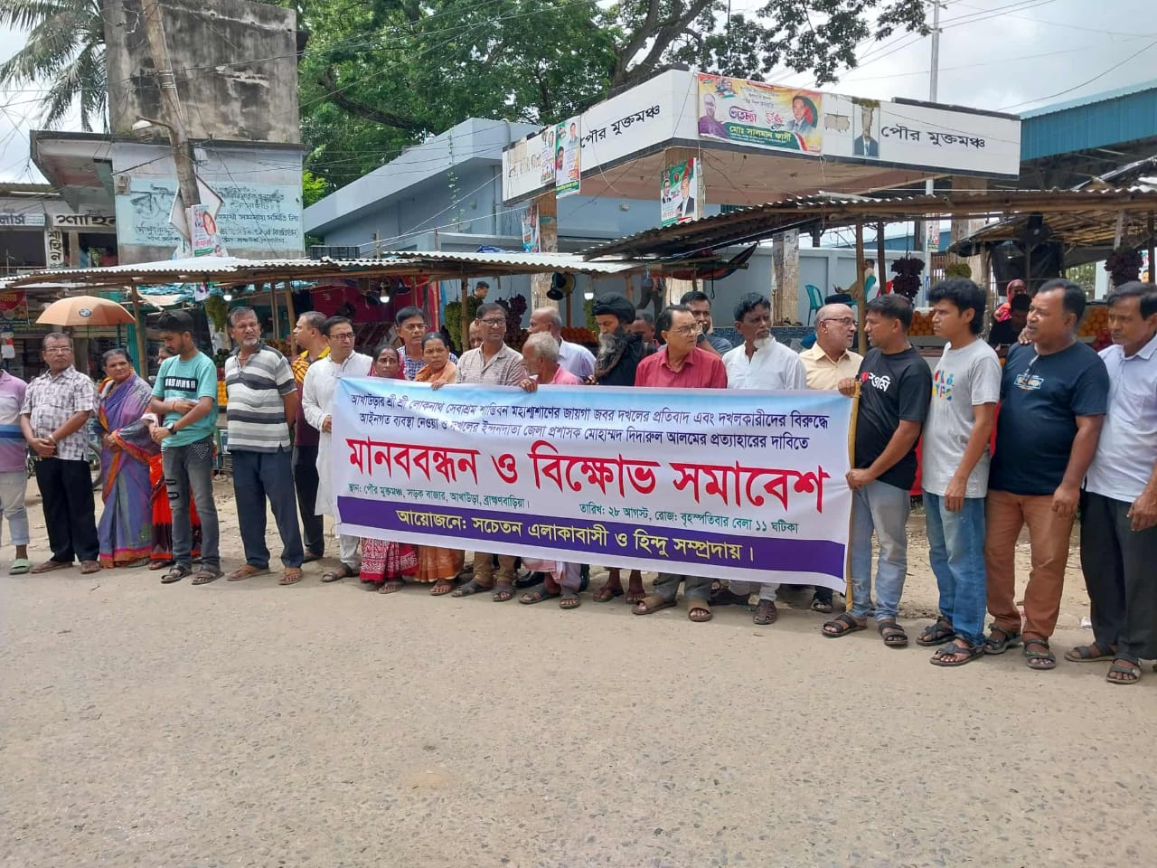 হিন্দু নেতারা অভিযোগ করে বলেন, গত ২০ আগষ্ট পৌরশহরের রাধানগর কলেজ পাড়ায় শ^শানের পাশে মাপঝোঁক করে খুঁটি দিয়ে লাল নিশান টানিয়ে দেয় উপজেলা প্রশাসন। প্রশাসন তখন আমাদেরকে বলেছিল তারা সরকারি জায়গা মাপঝোঁক করছে। কাউকে জায়গা বুঝিয়ে দিবে না। কিন্তু গত কয়েকদিন ধরে মুছা মিয়া নামে এক ব্যক্তি লাল নিশানের পাশে মাটি ফেলে শ^শানের জায়গায় দখল শুরু করেছে।