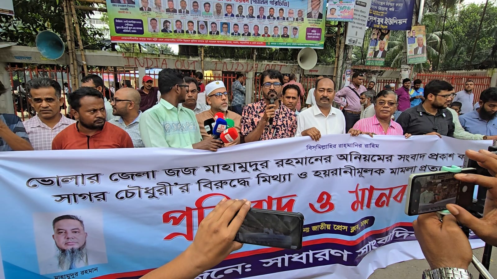 নিজস্ব প্রতিনিধি ভোলা) : ভোলার জেলা জজ এ এইচ এম মাহমদুর রহমানের দুর্নীতির খবর প্রকাশের জেরে সাংবাদিক সাগর চৌধুরীর বিরুদ্ধে দায়েরকৃত মিথ্যা মামলার প্রতিবাদে বিক্ষোভ ও মানববন্ধন অনুষ্ঠিত হয়েছে। বুধবার (১০ সেপ্টেম্বর ২০২৫) দুপুরে জাতীয় প্রেসক্লাবের সামনে এ কর্মসূচির আয়োজন করে সাধারণ সাংবাদিক সমাজ।