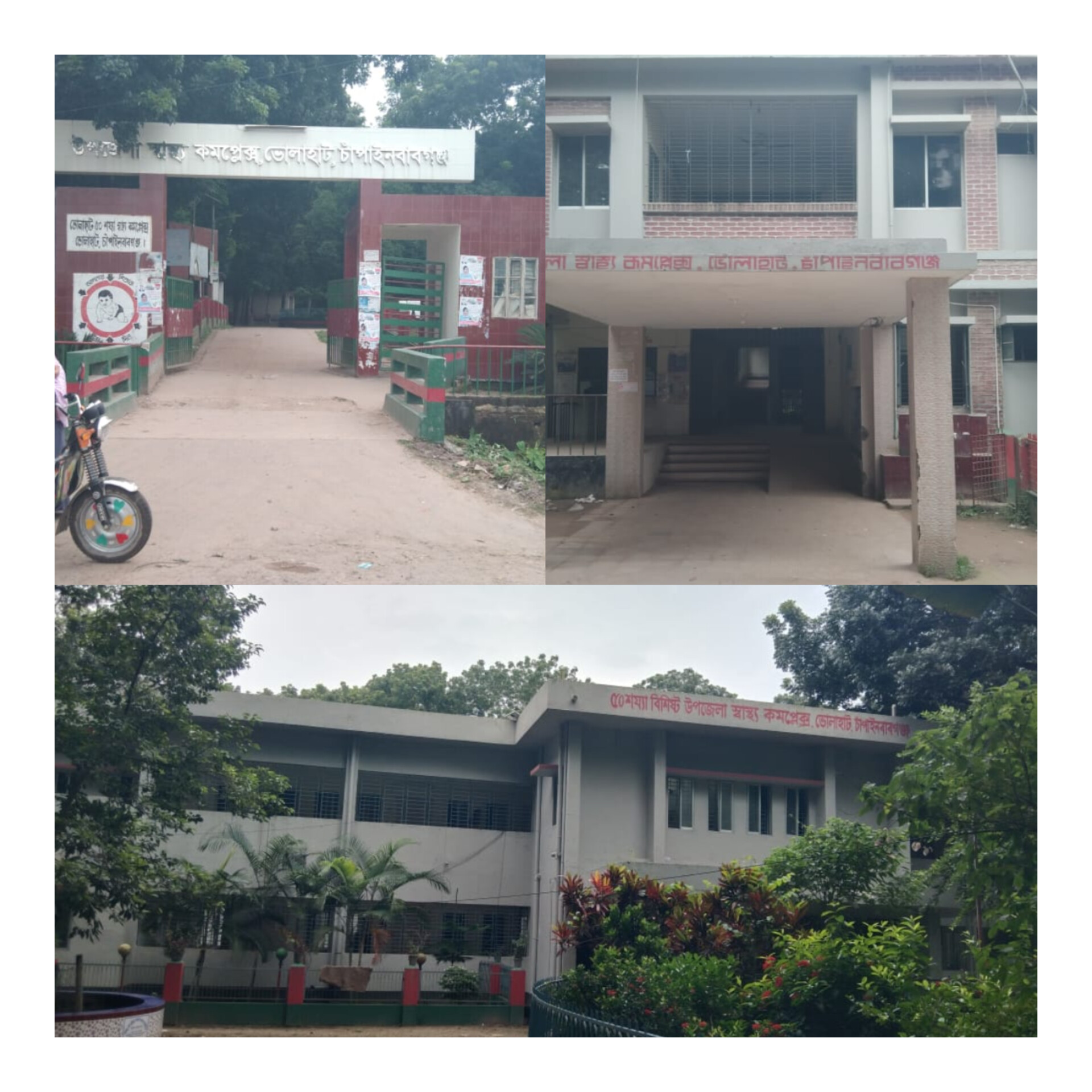 ভোলাহাট উপজেলা স্বাস্থ্য ও পরিবার পরিকল্পনা দপ্তরের সামনের গেট ও ভবনের ছবি।