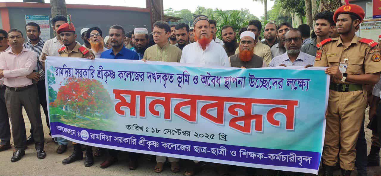 মোঃ সাইফুর রশিদ চৌধুরী : গোপালগঞ্জের কাশিয়ানী উপজেলার রামদিয়া সরকারি শ্রীকৃষ্ণ কলেজের বেদখলকৃত জায়গা উদ্ধারের দাবিতে মানববন্ধন অনুষ্ঠিত হয়েছে। বৃহস্পতিবার সকাল ১১টায় কলেজের প্রধান ফটকের সামনে কলেজ কর্তৃপক্ষের উদ্যোগে এই কর্মসূচি পালিত হয়।