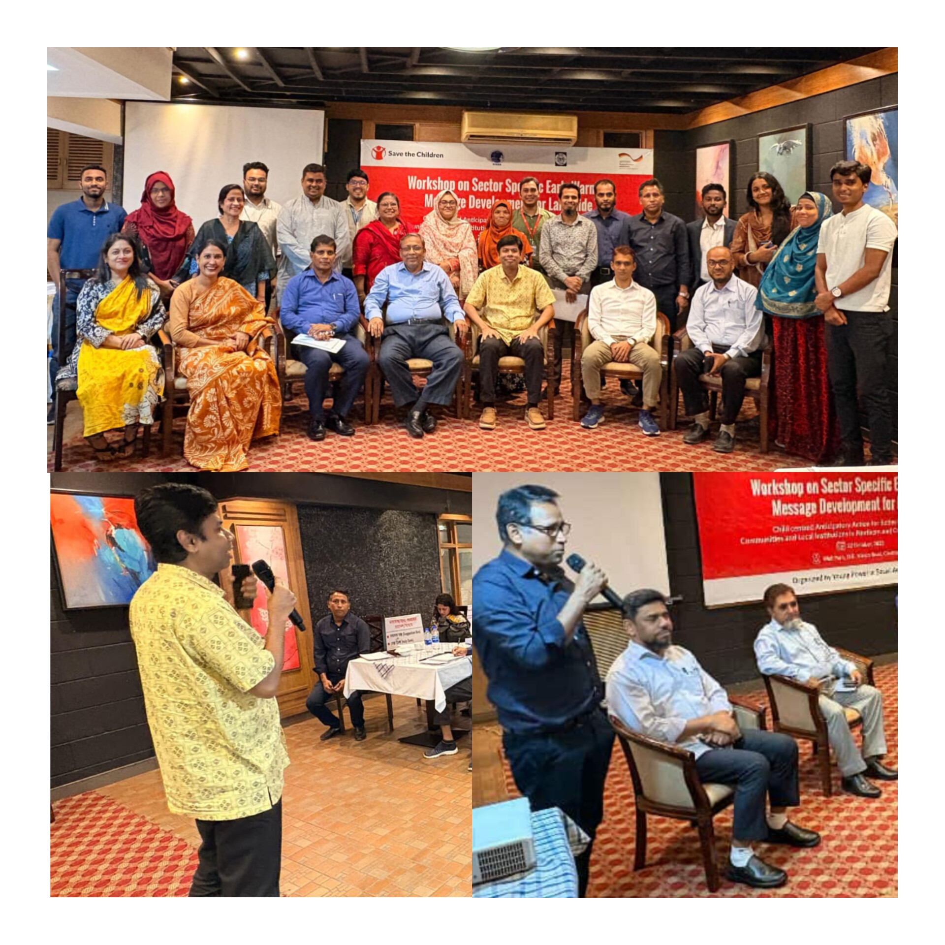 কর্মশালায় বাংলাদেশের উত্তর ও উপকূলীয় অঞ্চলে সম্প্রদায় এবং স্থানীয় প্রতিষ্ঠানগুলির প্রস্তুতির জন্য শিশু কেন্দ্রিক পূর্বাভাসমূলক আগাম পদক্ষেপ ও সতর্কবার্তা উন্নয়ণে একাধিক সেশন ও দিক নির্দেশনামূলক আলোচনা করা হয়।