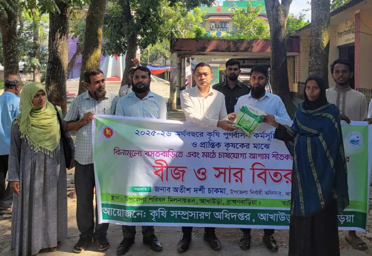 ব্রাহ্মণবাড়িয়া প্রতিনিধি : ব্রাহ্মণবাড়িয়ায় আখাউড়ায় কৃষি প্রণোদনা কর্মসূচির আওতায় মাঠে ক্ষুদ্র ও প্রান্তিক ২৮০ জন কৃষকদের মাঝে মাঠে চাষযোগ্য আগাম শীতকালীন সবজির বীজ ও সার বিনামূল্যে বিতরণ করা হয়েছে। মঙ্গলবার দুপুরে উপজেলা পরিষদ মাঠে কৃষকদের মাঝে ওই সার বীজ বিতরণ করা হয়। উপজেলা কৃষি সম্প্রসারণ অধিদপ্তর এ আয়োজন করে।