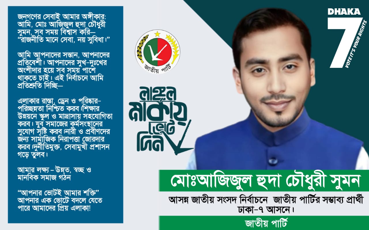 নিজস্ব প্রতিবেদক : আসন্ন জাতীয় সংসদ নির্বাচনে ঢাকা-৭ আসনকে কেন্দ্র করে রাজনৈতিক অঙ্গনে নতুন প্রাণের সঞ্চার ঘটেছে। এ আসনে জাতীয় পার্টির সম্ভাব্য প্রার্থী হিসেবে উঠে এসেছেন তরুণ উদ্যোক্তা ও সমাজসেবক মোঃ আজিজুল হুদা চৌধুরী সুমন। দীর্ঘদিন ধরে রাজনীতি, সমাজসেবা ও জনকল্যাণমূলক কর্মকাণ্ডে সক্রিয় থেকে তিনি সাধারণ মানুষের কাছে একজন নির্ভরযোগ্য ও গ্রহণযোগ্য নেতৃত্ব হিসেবে পরিচিতি পেয়েছেন।