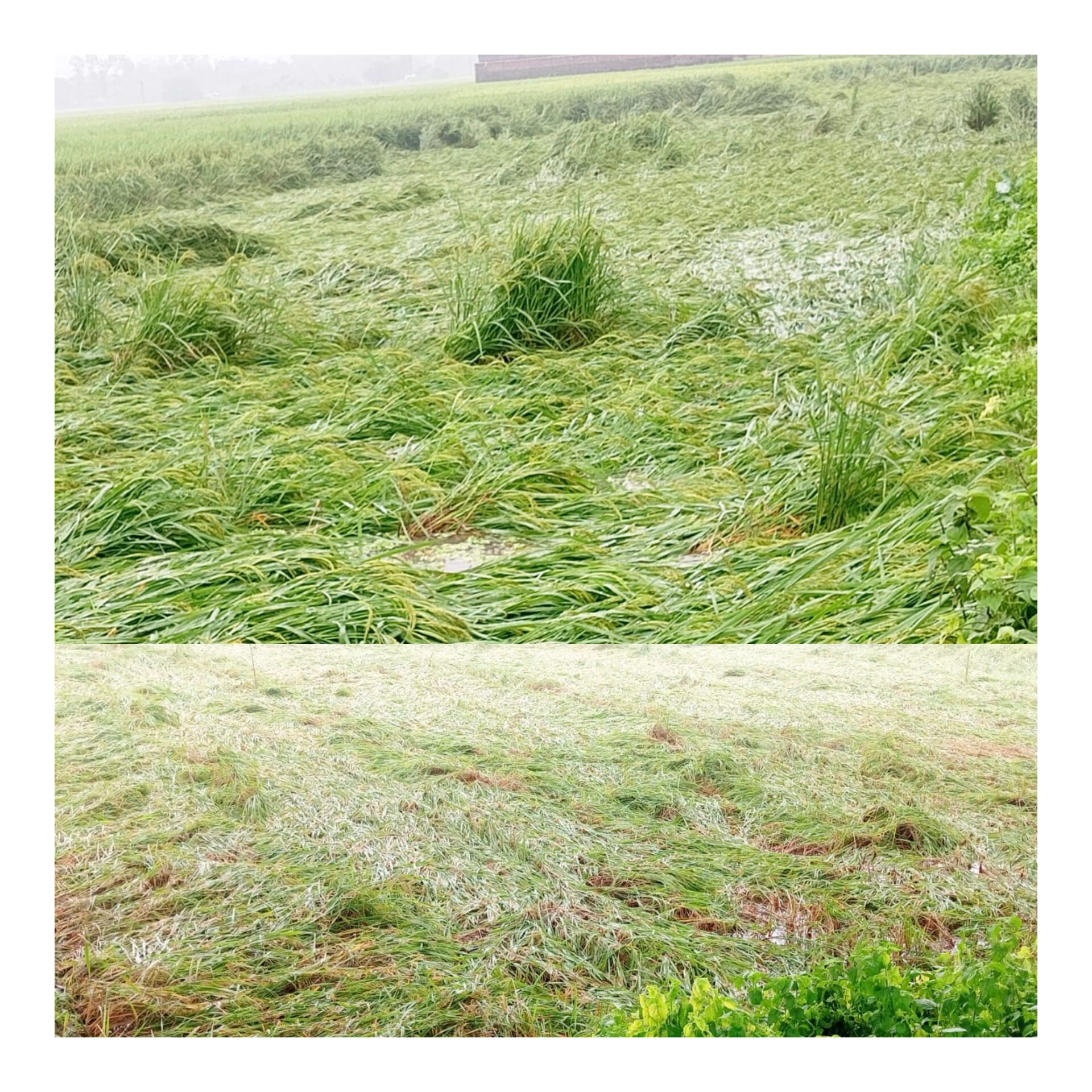 উপজেলার বিভিন্ন এলাকায় দেখা যায়, আধা-পাকা এবং পাকা ধানগাছ মাটিতে শুয়ে পড়েছে। অধিক নিচু জমিতে বৃষ্টির পানি জমেছে এবং সেই পানির মধ্যে পাকা ধানের শীষগুলো ডুবে আছে।