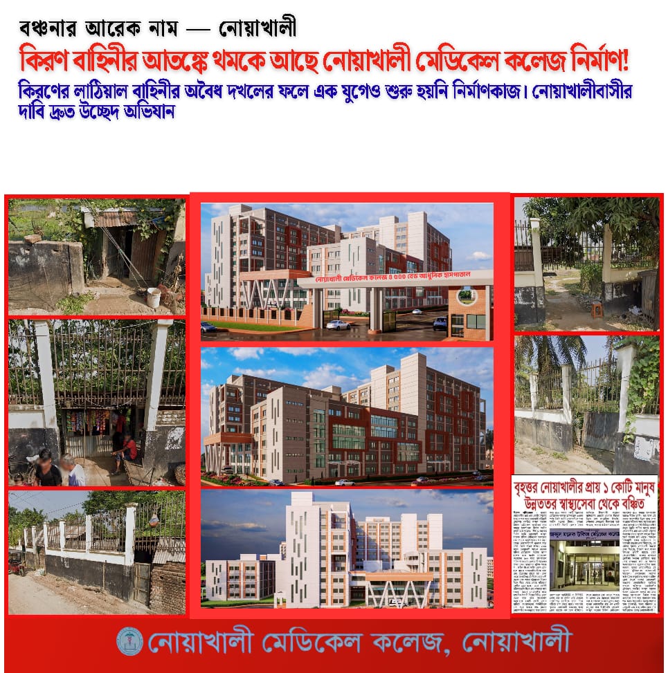 ২০১৮ সালের মে মাসে জাতীয় অর্থনৈতিক পরিষদের নির্বাহী কমিটির (একনেক) সভায় , ‘এস্টাবলিশমেন্ট অব ৫০০ বেডেড হাসপাতাল ও এনসিলারি ভবন ইন পাবনা, যশোর, কক্সবাজার ও নোয়াখালী মেডিকেল কলেজ ও ৫০০ বেড আধুনিক হাসপাতাল, নোয়াখালী’ অনুমোদিত হয়। প্রকল্পের অনুমোদিত প্রাক্কলিত ব্যয় ছিল ২ হাজার ১০৩ কোটি ৩২ লাখ টাকা কিন্তু বিগত ৭ বছরে অর্থাৎ জুন ২০২৫ সাল পর্যন্ত প্রকল্পের নোয়াখালী মেডিকেল কলেজ এর অবকাঠামোগত অগ্রগতি ছিলো প্রায় শূন্য। সম্প্রতি কলেজ কর্তৃপক্ষ জায়গা খালি করতে বললে তারা লাঠিসোটা হাতে তেড়ে আসে এবং প্রশাসনের নির্দেশ অমান্য করে প্রকাশ্য সংঘাতের হুমকি দেয়। নোয়াখালীবাসীর দাবি—অবিলম্বে অভিযান চালিয়ে কিরণ বাহিনীর দখলদারিত্ব উচ্ছেদ করে হাসপাতাল নির্মাণ শুরু করতে হবে।