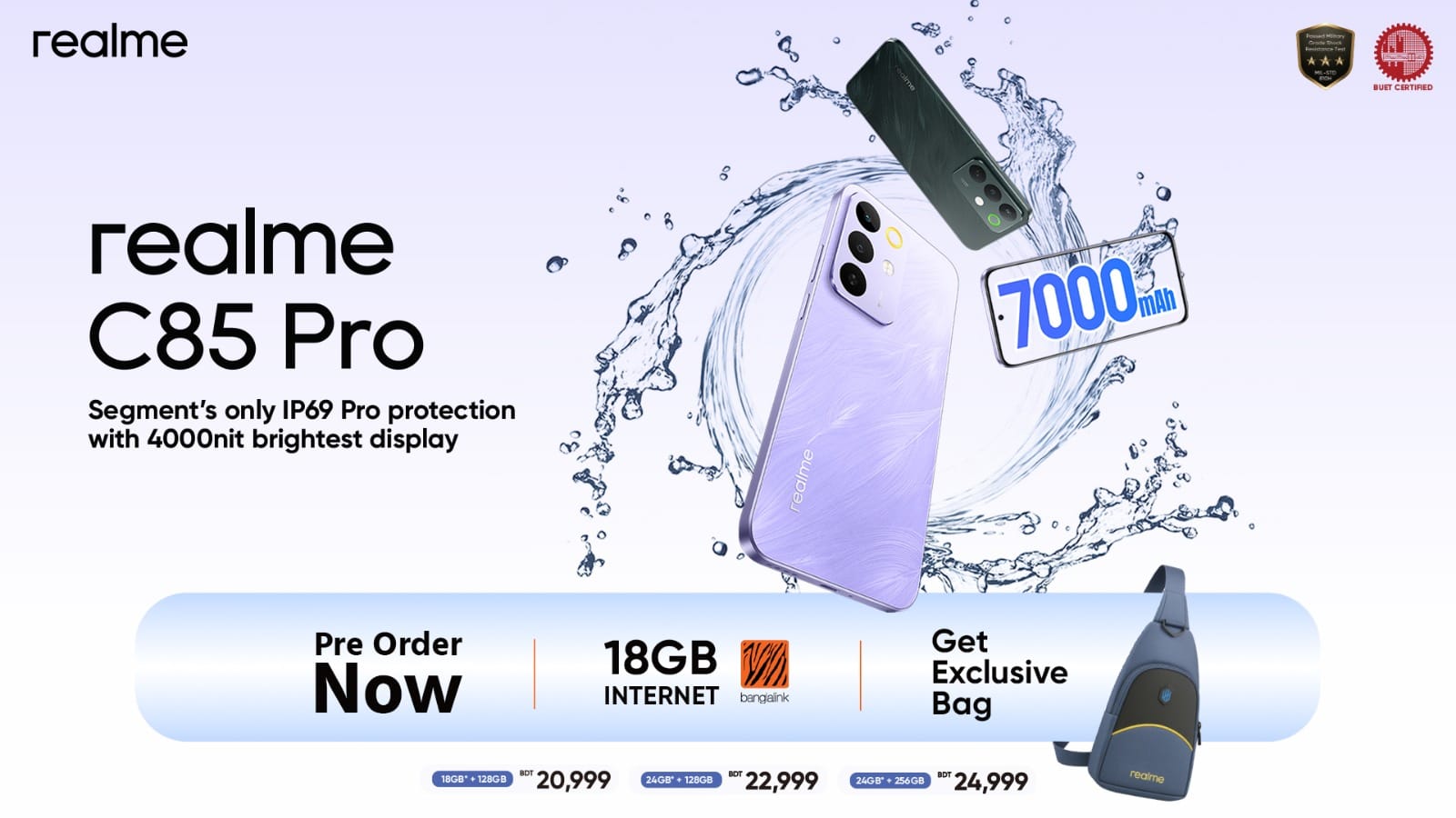 Customers can now pre-book the realme C85 Pro from 05–07 November at all realme brand stores and official reseller outlets nationwide and enjoy exclusive early access to the brand’s most durable C-series phone to date. Those who pre-book the device will enjoy a range of exclusive pre-order gifts, including an exclusive realme bag and special offers from Banglalink. These pre-order gifts are available for a limited time, and terms and conditions apply. These gifts will be provided to pre-order customers who collect their realme C85 Pro during the first sale period.