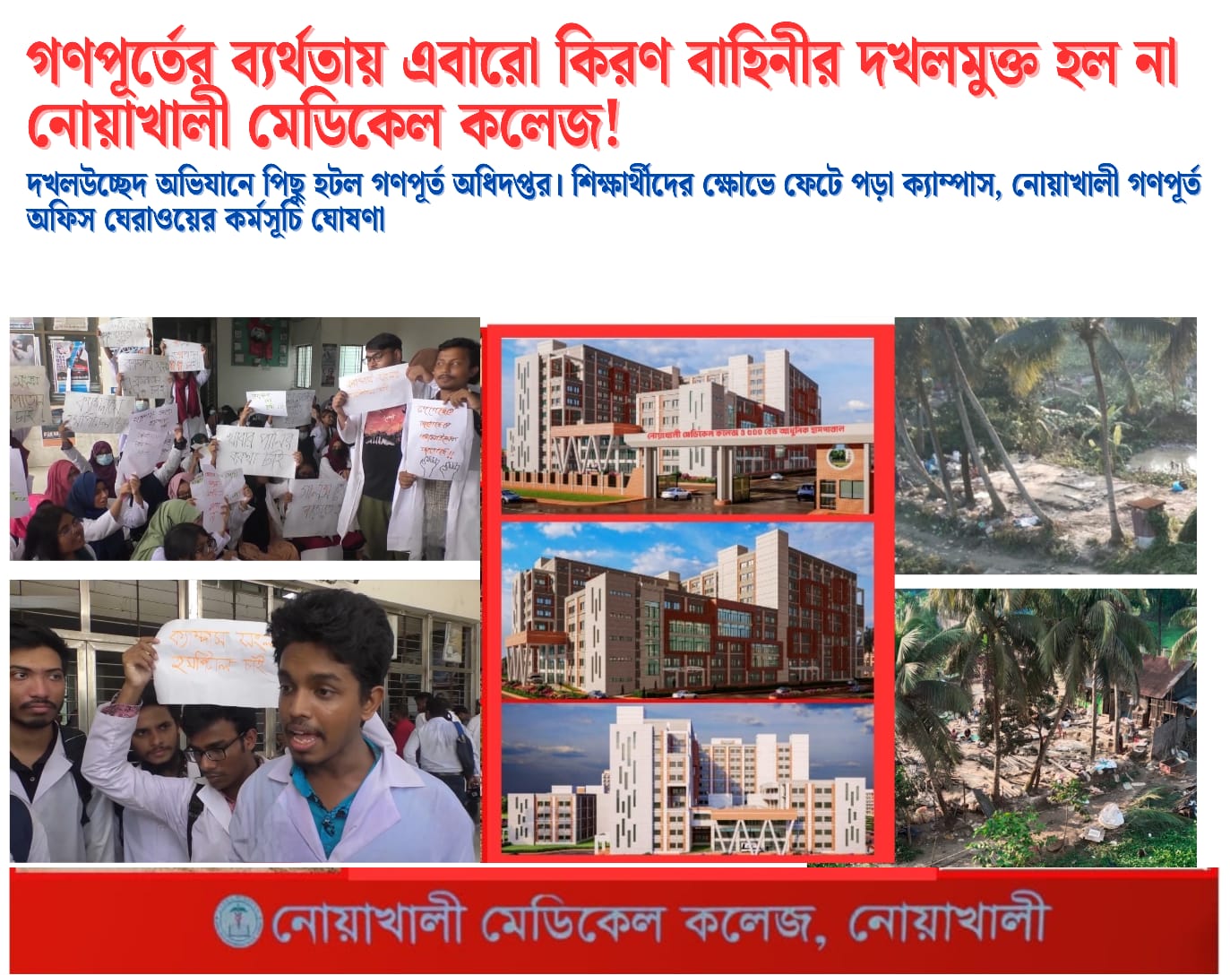 দুয়েকদিনের মধ্যেই ঘেরাও কর্মসূচি : বিকেলে মেডিকেল কলেজ ক্যাম্পাসে শিক্ষার্থীদের জরুরি সভায় সিদ্ধান্ত হয়, “গণপূর্ত অধিদপ্তর আমাদের স্বপ্ন ধ্বংস করছে। এই অবহেলা মেনে নেওয়া হবে না।” সর্বসম্মতিক্রমে ঘোষণা আসে, “দুয়েকদিনের মধ্যেই আমরা নোয়াখালী পূর্তভবন ঘেরাও করব।” শিক্ষার্থীদের একজন বলেন, “সরকারি প্রকল্পের নামে কোটি কোটি টাকা বরাদ্দ হয়, অথচ বাস্তবায়ন ঠেকিয়ে রেখেছে কিরণের দখলদার বাহিনী। আমরা চুপ থাকব না।”