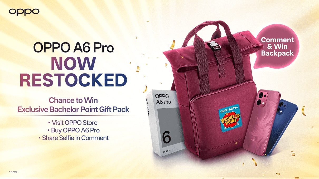অপো এ৬ প্রোর বিপুল চাহিদা ও আবারো বাজারে সহজলভ্যতা উদযাপন করতে বিশেষ অফার নিয়ে আসা হয়েছে। ক্রেতারা এখন তাদের প্রিয় ‘ব্যাচেলর পয়েন্ট’ চরিত্রের নাম কমেন্ট করে একটি বিশেষ ব্যাকপ্যাক জেতার সুযোগ পাচ্ছেন।