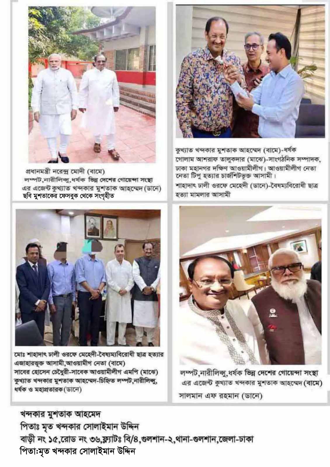 শতাধিক শিশু,ছাত্রী, পরনারীর যৌন নির্যাতনকারী, অপহরণকারী, ধর্ষক,প্রতারক,দূর্নীতিবাজ,ভূয়া দাতা ভোটার কর্তৃক নির্বাচিত ঢাকাস্থ মতঝিল আইডিয়াল স্কুল এন্ড কলেজের সাবেক ভূয়া দাতা সদস্য, আওয়ামী ফ্যাসিবাদের দোসর,ভিন্নদেশীয় গোয়েন্দা সংস্থার চর যিনি ভারতের প্রধানমন্ত্রী নরেন্দ্র মোদির সাথে একাধিকবার গোপনে বৈঠক করেছেন যা আমেরিকান প্রবাসী সাংবাদিক ইলিয়াস হোসাইন তার ইউটিউব চ্যানেলে উল্লেখ করেছেন, বৈষম্যবিরোধী ছাত্র হত্যার একাধিক মামলার এজাহারভূক্ত আসামি,বিএনপি চেয়ারপারসন বেগম খালেদা জিয়াকে তাঁর গুলশানের বাসা ‘ফিরোজা’র সামনে ২০১৩ সালরে ২৯শে ডিসেম্বর বালুর ট্রাক দ্বারা অবরুদ্ধ ও বিষাক্ত পিপার স্প্রে দ্বারা হত্যাচেষ্টার অন্যতম মূলহোতা,মাস্টার মাইন্ড ও বালুর ট্রাকগুলি গুলি তার ‘এসেনশিয়াল ইষ্টাব্লিশমেন্ট’ কনসট্রাকশন কোম্পানির। বালুর ট্রাককান্ড মামলার এজাহারভূক্ত আসামি গুলশান ডিবির উপকমশিনার শেখ নাজমূল আলম কুখ্যাত খন্দকার মুশতাক আহমেদের রিলেটিভ এবং ২০১৫সালের ২০,২১ ও ২২শে এপ্রিল,ঢাকাস্থ ফকিরাপুল,কারওয়ান বাজার ও বাংলামটরে বিএনপি চেয়ারপারসন বেগম খালেদা জিয়ার গাড়ীবহরে হামলার মূলহোতা,মাস্টার মাইন্ড।