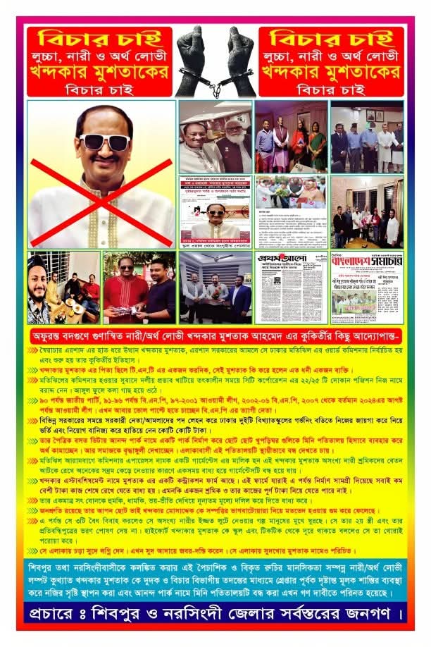 নরসিংদী বিএনপির কিছু অর্থলোভী ব্যক্তি মোটা অংকের টাকার বিনিময়ে জনাব ভারপ্রাপ্ত চেয়ারম্যান জননেতা জনাব তারেক জিয়ার নির্দেশ অমান্য করে বিএনপি থেকে ৫ই এপ্রিল ২০২৪ইং সালে বহিষ্কৃত ফ্যাসিবাদের দোসর , শতাধিক শিশু,ছাত্রী নির্যাতনকারী,নারী নির্যাতনকারী,ধর্ষক,নারীলিপ্সু,লম্পট,প্রতারক, আন্তর্জাতিক চাপাবাজ ও মিথ্যার ফ্যাক্টরী কুখ্যাত খন্দকার মুশতাক আহমেদকে অবৈধ অনুপ্রবেশের করার সুযোগ করে দিয়েছে। সবাইকে মনে রাখতে হবে, খোলস পাল্টালেও সাপ কিন্তু সাপই থাকে। বিএনপির দৃষ্টি আকর্ষণ করছি,দলীয় হাই কমান্ডের নেতৃত্ব একটি তদন্ত কমিটি গঠন করে বিএনপির দায়ী ব্যক্তিদের বিরুদ্ধে সাংগঠনিক শাস্তিমূলক ব্যবস্থা গ্রহণ করার জোর দাবি জানিয়েছে নরসিংদীর জনসাধারণ।