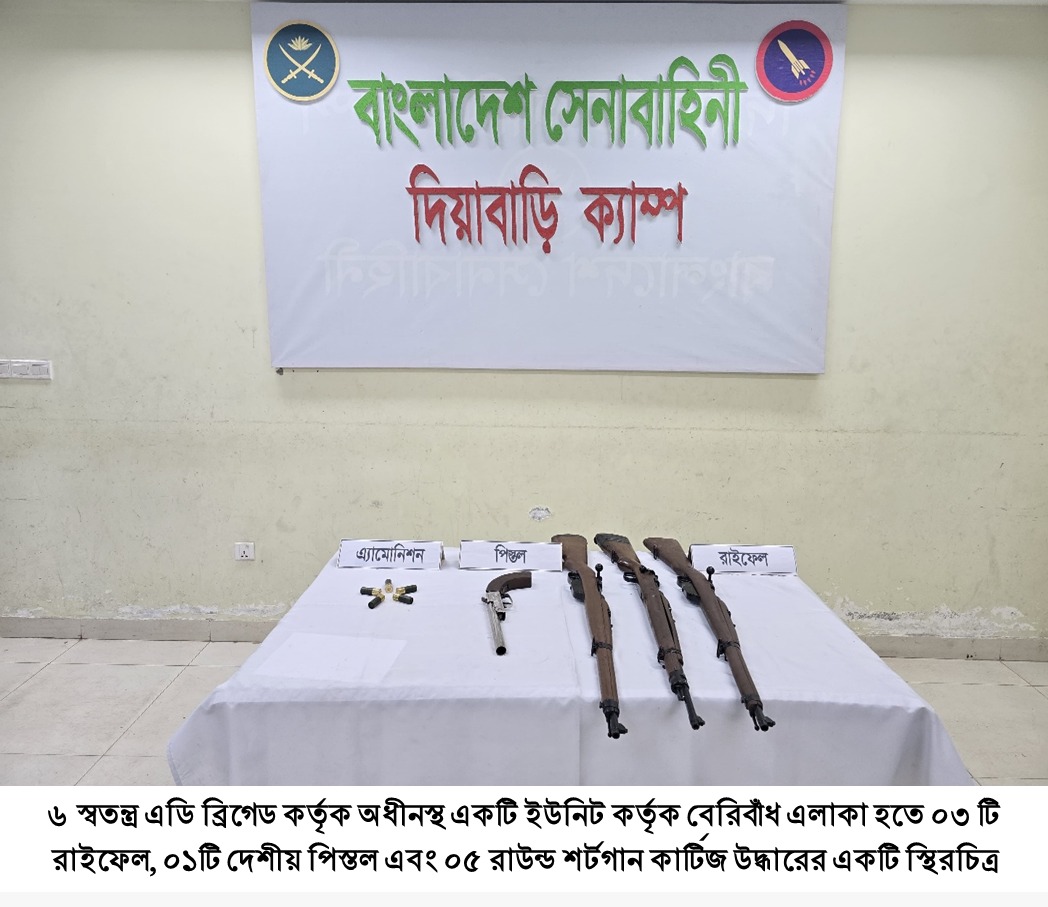 রাজধানীর তুরাগ থানাধীন বেড়িবাঁধ এলাকা হতে সেনা অভিযানে ০৩ টি রাইফেল, ০১টি দেশীয় পিস্তল এবং ০৫ রাউন্ড শর্টগান কার্টিজ উদ্ধার
