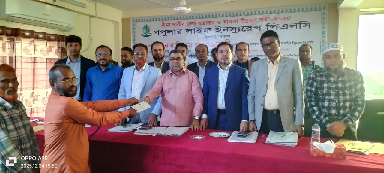 খুলনায় পপুলার লাইফ ইনসুরেন্স পিএলসি’র বীমা দাবীর চেক হস্তান্তর ও ব্যবসা উন্নয়ন সভা অনুষ্ঠিত হয়েছে। বৃহস্পতিবার সকালে শীববাড়ি এলাকায় পপুলার লাইফ ইনসুরেন্সের নিজস্ব ভবনের ৭ম তলায় খুলনা অঞ্চলের সকল কর্মী ও অফিসের কর্মরত কর্মকর্তাদের নিয়ে একটি বিশেষ সভা অনুষ্ঠিত হয়। সভায় আল আমীন বীমা প্রকল্পের প্রকল্প পরিচালক সৈয়দ সাইফুল ইসলাম রুবেল এর সভাপতিত্বে প্রধান অতিথির বক্তব্য রাখেন পপুলার লাইফ ইনসুরেন্স পিএলসি এর অতিরিক্ত ব্যবস্থাপনা পরিচালক বি এম শওকত আলী।