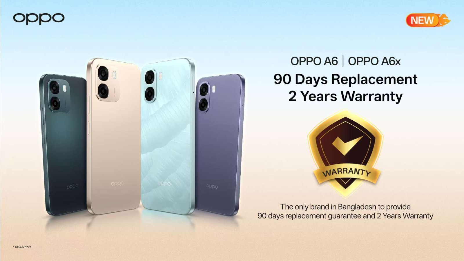 বাংলাদেশে প্রথমবারের মতো অপো এ৬ বা এ৬এক্স কেনা ক্রেতারা সম্পূর্ণ ৯০ দিনের রিপ্লেসমেন্ট সাপোর্ট উপভোগ করতে পারবেন। যা আগে কখনও পাওয়া যায়নি এমন মানসিক প্রশান্তি দেবে।অপো এ৬-এ সুবিশাল ৭০০০ মিলিঅ্যাম্পিয়ার ব্যাটারি ব্যবহার করা হয়েছে, যা পুরো দিনের ব্যবহার ছাড়িয়েও ব্যতিক্রমী সহনশীলতা নিশ্চিত করে।