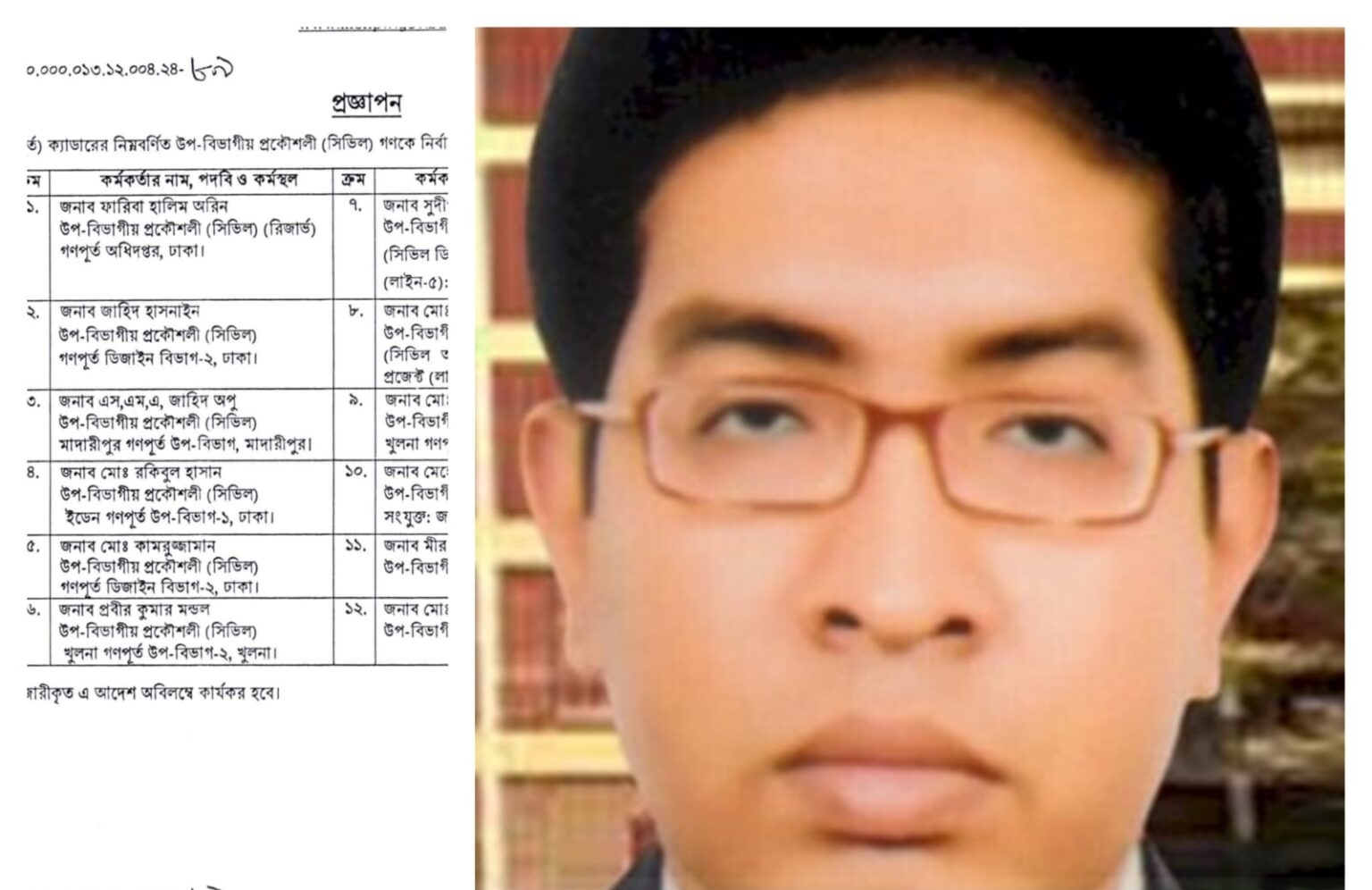 নিজস্ব প্রতিবেদক : রাষ্ট্রপতির আদেশক্রমে ১৭ নভেম্বর প্রকাশিত প্রজ্ঞাপনে মো. রাকিবুল হাসানের নির্বাহী প্রকৌশলী পদে পদোন্নতির খবর প্রকাশের পর গণপূর্ত অধিদপ্তরে ছড়িয়ে পড়ে অভূতপূর্ব তোলপাড়। কারণ, যাঁকে রাষ্ট্রীয় ‘বিশ্বাস’ দিয়ে উচ্চ পদে উন্নীত করা হলো, ঠিক সেই ব্যক্তি গত ১১ বছর ধরে সরকারি চাকরি করে নিজেই ঠিকাদারি ব্যবসা চালিয়ে কয়েকশো কোটি টাকার অনিয়ম, কমিশন বাণিজ্য ও প্রকল্প লুটপাটের অভিযোগে জর্জরিত।