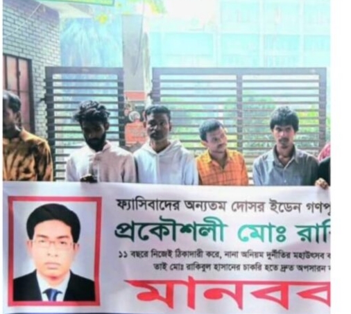 তাদের বক্তব্য—“সরকারি কর্মকর্তা হয়েও তিনি ১১ বছর ধরে ঠিকাদারি ব্যবসা করছেন। কমিশন না দিলে ফাইল আটকে রাখেন, আর কমিশন দিলে নিম্নমানের কাজও পাস হয়ে যায়। তিনি গণপূর্তের কালো সিন্ডিকেটের কেন্দ্রবিন্দু।”