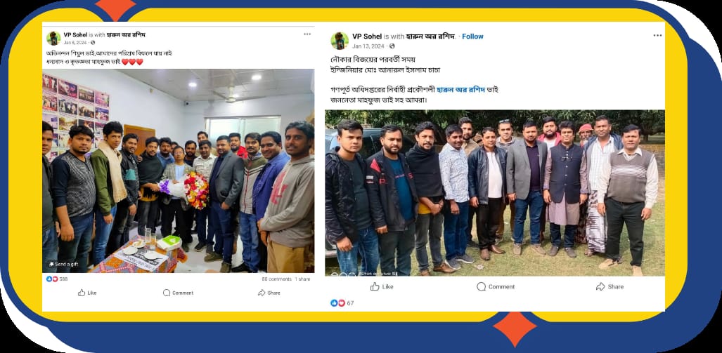 সাবেক ছাত্রনেতা হারুন অর রশিদ, নির্বাহী প্রকৌশলী, রাজশাহী পি. ডব্লিউ, ডিভিশন-১, রাজশাহী। শুভ হোক আপনার আগামীর দিনগুলো, ভালবাসা অবিচল ভাই।” ৬ ফেব্রুয়ারী ২০২২ Faisal Haque সহ গোমস্তাপুর উপজেলা ছাত্রলীগের নেতৃবৃন্দ রাজশাহী গণপূর্ত এর নির্বাহী প্রকৌশলী হারুন অর রশিদ এর অফিসে তাকে ফুল দিয়ে শুভেচ্ছা জানিয়ে ফেসবুকে লিখেছেন, “ছাত্রলীগের অগ্রজ, গনপূর্ত বিভাগ-১, রাজশাহীর নির্বাহী প্রকৌশলী শ্রদ্ধেয় হারুন অর রশিদ ভাই এর সাথে ফুলেল শুভেচ্ছা বিনিময়কালে গোমস্তাপুর উপজেলা ছাত্রলীগের নেতৃবৃন্দ।” ৮ই জানুয়ারী ২০২৪ এর ডামি ভোটে চাপাইনবাবগঞ্জ ১ (শিবগঞ্জ) আসনে ডা: শিমুল জেতার পর VP Sohel ও হারুন অর রশিদ ডা: শিমুল কে ফুল দিয়ে শুভেচ্ছা জানানোর একটি ছবি পোস্ট করে লিখেছেন, ” অভিনন্দন শিমুল ভাই, আমাদের পরিশ্রম বিফলে যায় নাই। ধন্যবাদ ও কৃতজ্ঞতা মাহফুজ ভাই।” একই ব্যাক্তি ১৩ জানুয়ারি ২০২৪ এ ডামি নির্বাচনের পরবর্তী সময়ে ইঞ্জিনিয়ার আনারুল ইসলাম কে ফুলের মালা পরিয়ে লিখেছেন, “নৌকার বিজয়ের পরবর্তী সময় ইন্জিনিয়ার মোঃ আনারুল ইসলাম চাচা, গণপূর্ত অধিদপ্তরের নির্বাহী প্রকৌশলী হারুন অর রশিদ ভাই, জননেতা মাহফুজ ভাই সহ আমরা।”