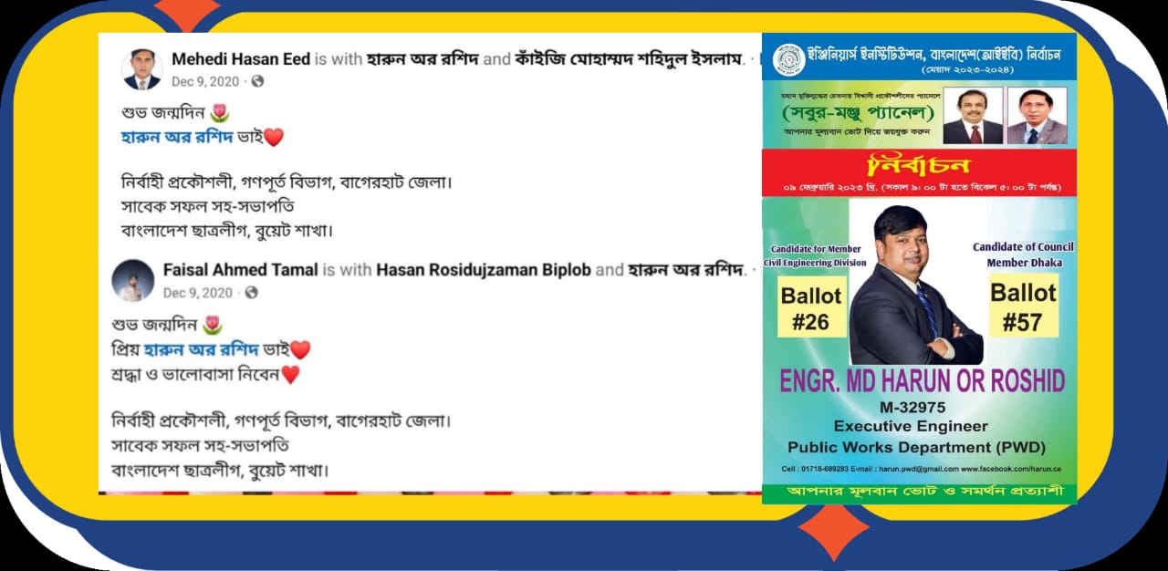 বুয়েট ছাত্রলীগের সহ সভাপতিকে রাজশাহী থেকে আনা হয়েছে নারায়ণগঞ্জে, তার গুণকীর্তন শুরুটা করা যাক কয়েকটি ফেসবুক পোস্ট দিয়ে। ৯ ডিসেম্বর ২০২০ এ Faisal Ahmed Tamal গণপূর্ত অধিদপ্তর এর নির্বাহী প্রকৌশলী হারুন অর রশিদ কে জন্মদিনের শুভেচ্ছা জানিয়ে তার ফেসবুক ওয়ালে পোস্ট করেছেন “শুভ জন্মদিন, প্রিয় হারুন অর রশিদ ভাই, শ্রদ্ধা ও ভালোবাসা নিবেন, নির্বাহী প্রকৌশলী, গণপূর্ত বিভাগ, বাগেরহাট জেলা। সাবেক সফল সহ সভাপতি, বাংলাদেশ ছাত্রলীগ, বুয়েট শাখা।” একইদিন Mehedi Hasan Eed লিখেছেন “শুভ জন্মদিন, হারুন অর রশিদ ভাই, নির্বাহী প্রকৌশলী, গণপূর্ত বিভাগ, বাগেরহাট জেলা। সাবেক সফল সহ-সভাপতি, বাংলাদেশ ছাত্রলীগ, বুয়েট শাখা।” ৯ ডিসেম্বর ২০২২ এ Anm Abdullah Hil Baky লিখেছেন, “শুভ জন্মদিন প্রিয় ভাই, সাবেক ছাত্রনেতা হারুন অর রশিদ, নির্বাহী প্রকৌশলী, রাজশাহী পি. ডব্লিউ. ডিভিশন-১, রাজশাহী, শুভ হোক আপনার আগামীর দিনগুলো, ভালবাসা অবিচল ভাই। ট্রিট টা পাওনা রইলো” জবাবে জনাব হারুন অর রশিদ লিখেছেন Thank you.” ৯ ডিসেম্বর ২০২৩ এ মোঃ পলাশ আলী লিখেছেন, “শুভ জন্মদিন প্রিয় ভাই,