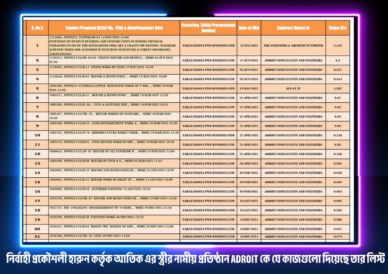 এমনকি গত ১০ মার্চ ২০২৫ এ হারুন ৫ টি LTM এবং ১ টি OTM এর মাধ্যমে মোট ৬টি কাজের দরপত্র আহবান করে। এবং মজার বিষয় ৬টি কাজের মধ্যে ৬টিই পেয়েছে বড়ভাই আতিক এর কোম্পানি Adroit এবং ৬টি কাজেরই NOA দেয়া হয়েছে ২১ এপ্রিল ২০২৫ এ।