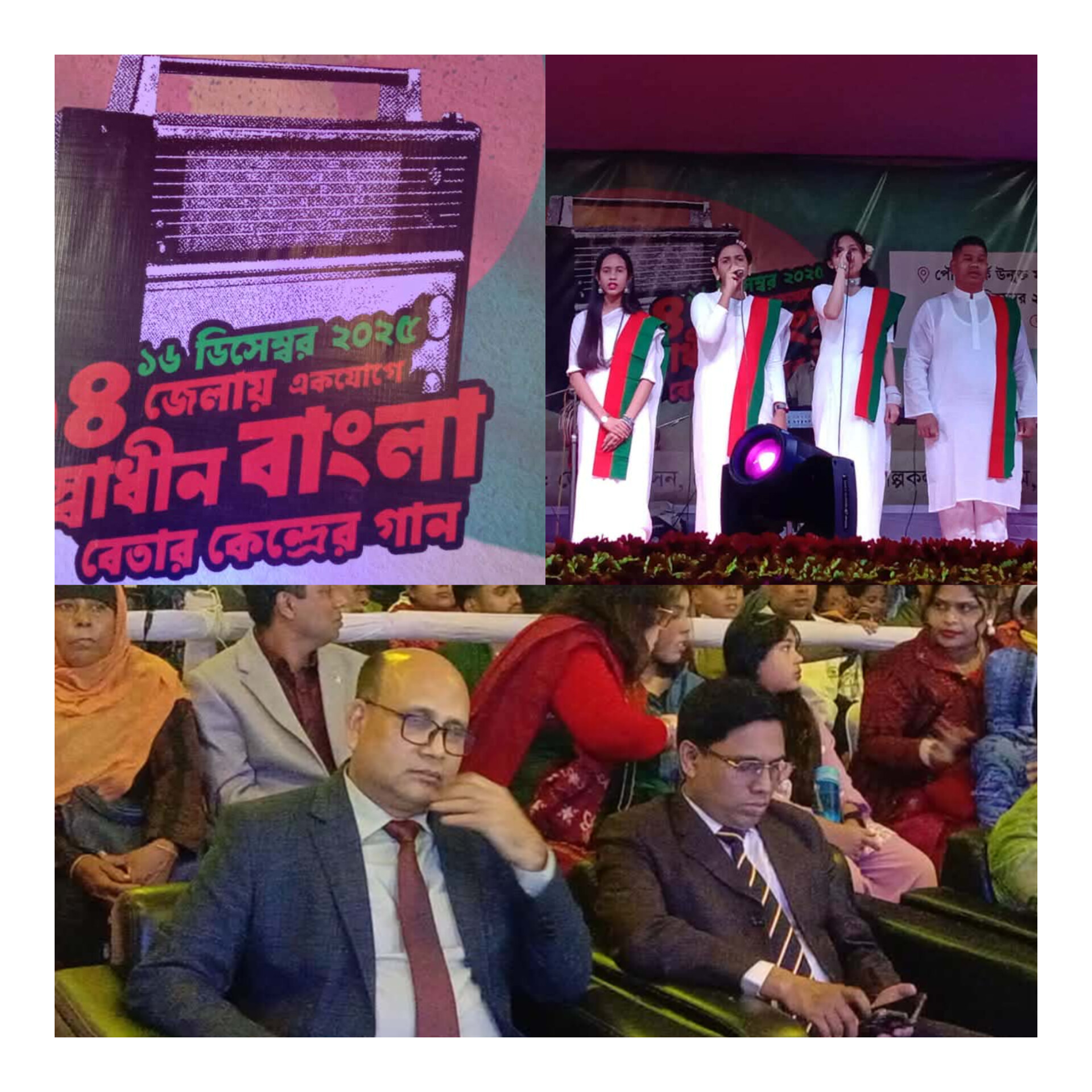 মোঃ সাইফুর রশিদ চৌধুরী : মহান বিজয় দিবস ২০২৫ উদযাপন উপলক্ষে সারাদেশে ন্যায় গোপালগঞ্জ জেলা প্রশাসন ও জেলা শিল্পকলা একাডেমির তত্ত্বাবধানে স্বাধীন বাংলা বেতার কেন্দ্রের গান পরিবেশনার অনুষ্ঠানের আয়োজন করে। জেলা শিল্পকলা একাডেমীর কালচারাল অফিসার ফারহান কবীর সিফাত-এর পরিচালনায় এই বিশেষ আয়োজনে পরিবেশিত হয় কালজয়ী ‘স্বাধীন বাংলা বেতার কেন্দ্রের গান’।