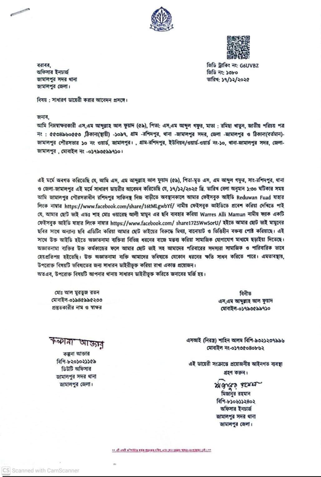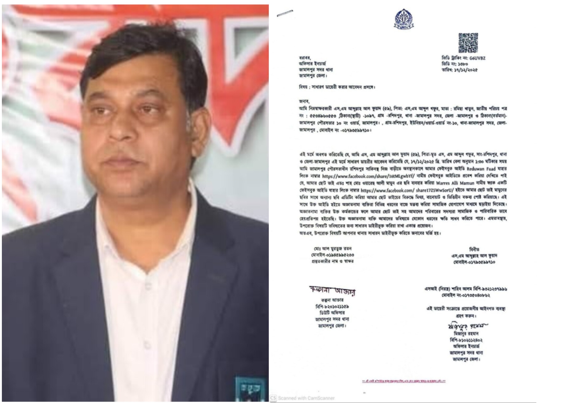 ওয়ারেছ আলী মামুনকে হেয় প্রতিপন্ন করার অভিযোগে থানায় জিডি