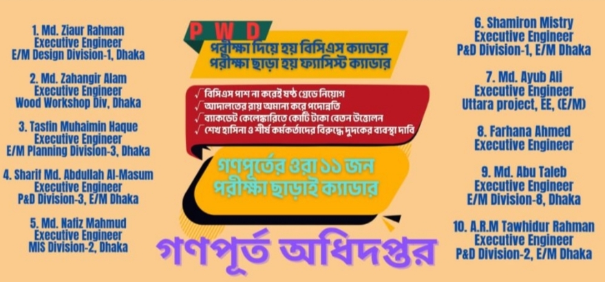 আদালতের রায় উপেক্ষা, বিসিএস কর্মকর্তাদের জ্যেষ্ঠতা বঞ্চিত : আদালতের নির্দেশে ১৭ জন রিটকারী বিসিএস কর্মকর্তার পদ সংরক্ষণের আদেশ থাকা সত্ত্বেও গণপূর্ত অধিদপ্তর ও মন্ত্রণালয় তা উপেক্ষা করে অবৈধ নিয়োগপ্রাপ্তদের বিসিএস কর্মকর্তাদের ওপর জ্যেষ্ঠতা দিয়েছে। সরকার পরিবর্তনের পর বিসিএস কর্মকর্তারা প্রধান প্রকৌশলীর কাছে গ্রেডেশন চাইলেও বর্তমান প্রধান প্রকৌশলী মোঃ শামীম আখতার নিষ্ক্রিয় ভূমিকা পালন করছেন বলে অভিযোগ।