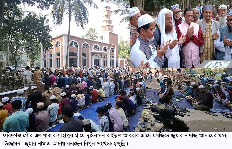 নিজস্ব প্রতিনিধি (চাঁদপুর)  :  চাঁদপুরের ফরিদগঞ্জ উপজেলার সাহাপুর গ্রামে নবনির্মিত একটি দৃষ্টিনন্দন মসজিদের  উদ্বোধন অনুষ্ঠিত হয়েছে। ১৬ জানুয়ারি মসজিদটির আনুষ্ঠানিক উদ্বোধন করেন জাতীয় মসজিদ বায়তুল মোকাররমের পেশ ইমাম হাফেজ মাওলানা মুফতি মহিউদ্দিন কাসেম।